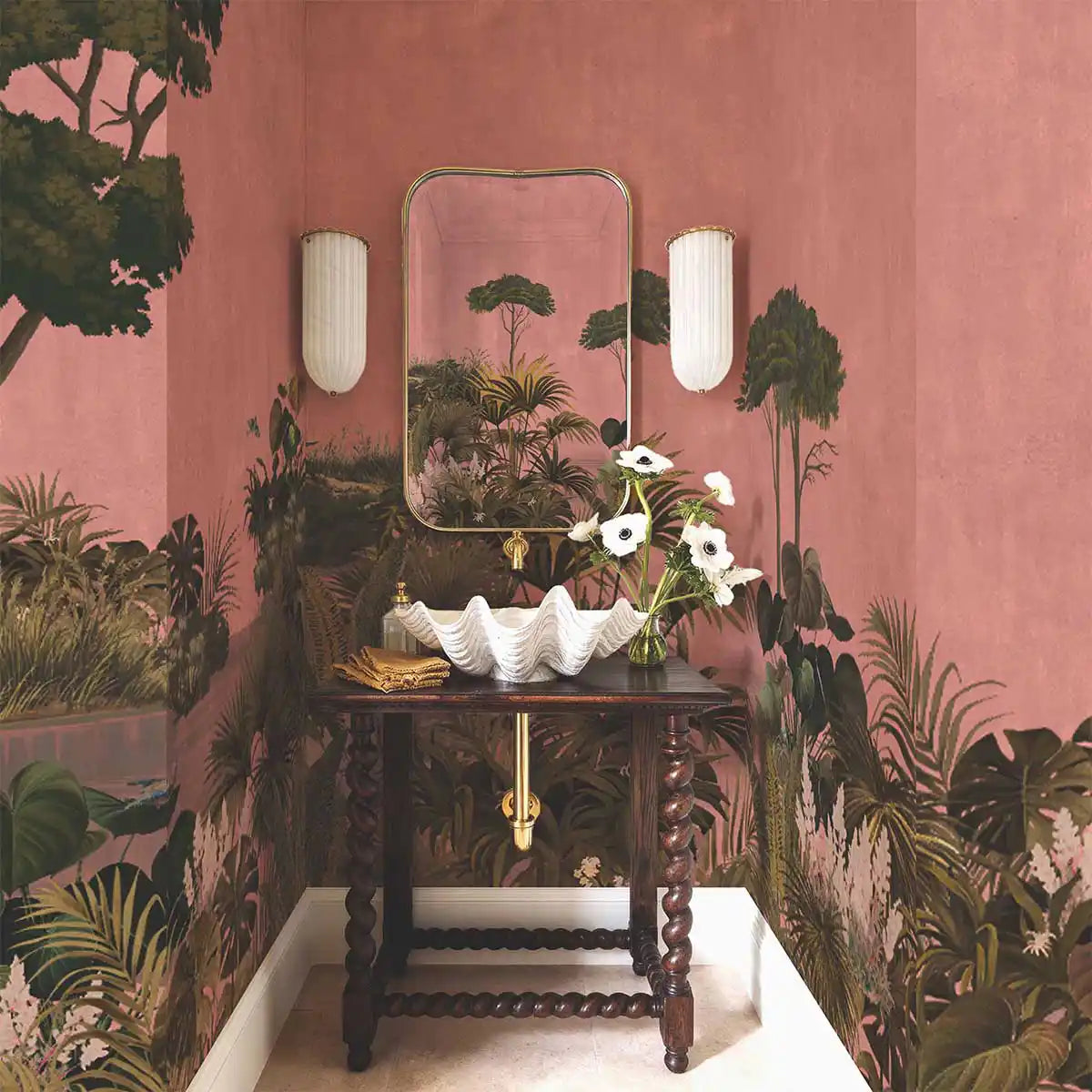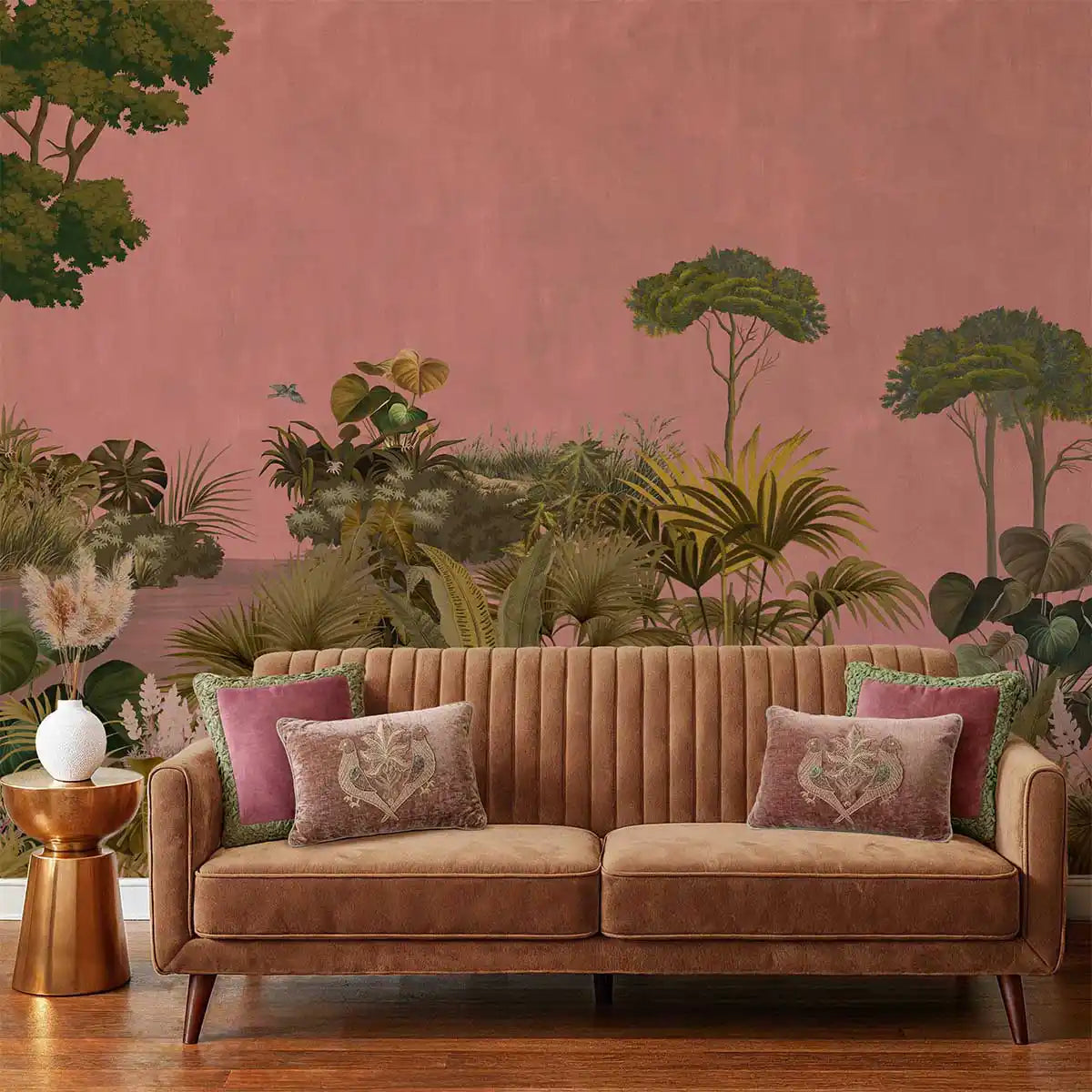 Like a painting from a vintage journal, intricate layers of foliage rise against a soft, rosy backdrop capturing the essence of a tropical paradise, surrounding you with the peaceful rustle of nature and a bold splash of color. The sophisticated charm of a tropical conservatory, blending artistic detail with the calming hues of dusk.