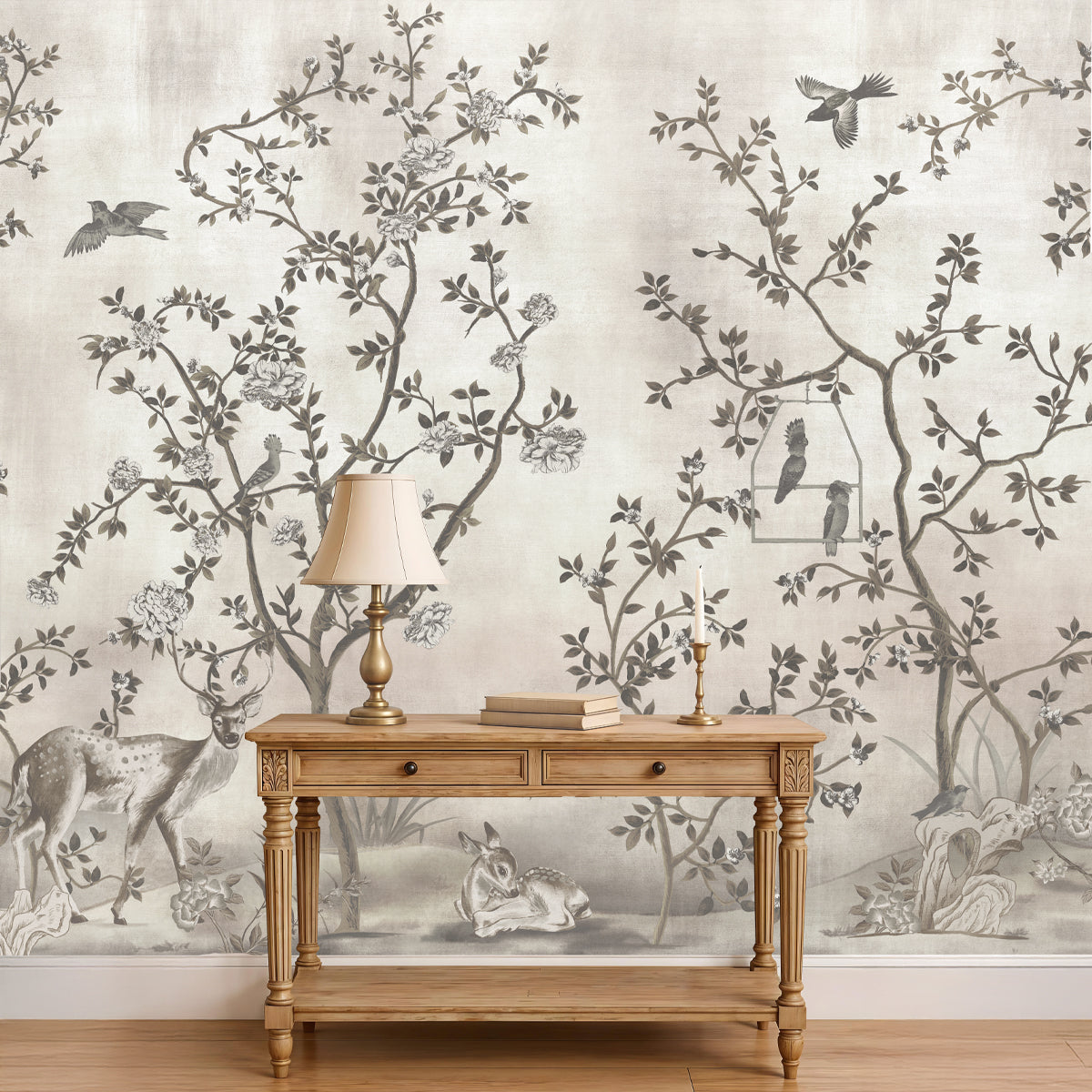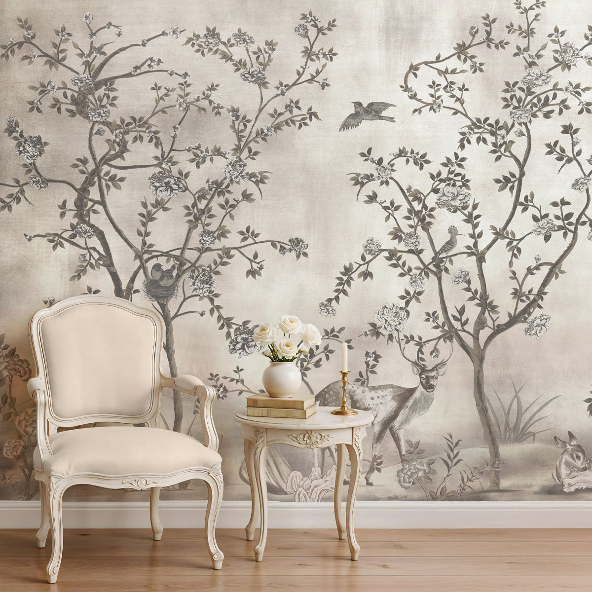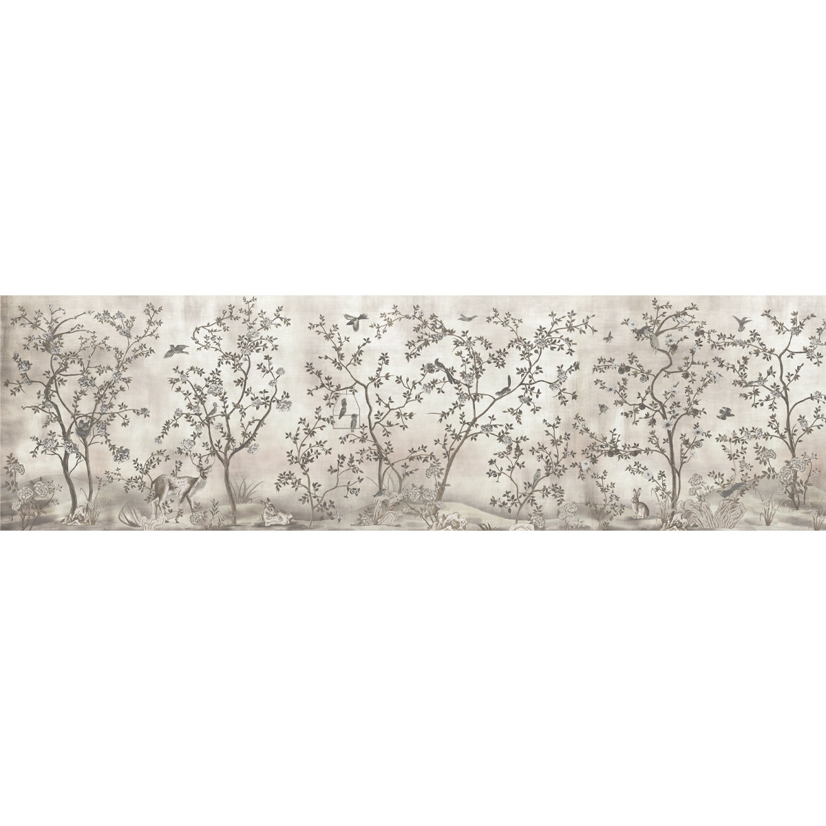 This wallpaper captures a moment in a monochromatic woodland, rendered in soft greys to evoke a timeless, hand-painted mural. The grisaille palette layering soft greys, taupes, and muted whites gives the design the timeless, artistic feel of a hand-painted mural. It brings a dreamlike quality to the space, surrounding you with a calming natural rhythm that softens the modern world.