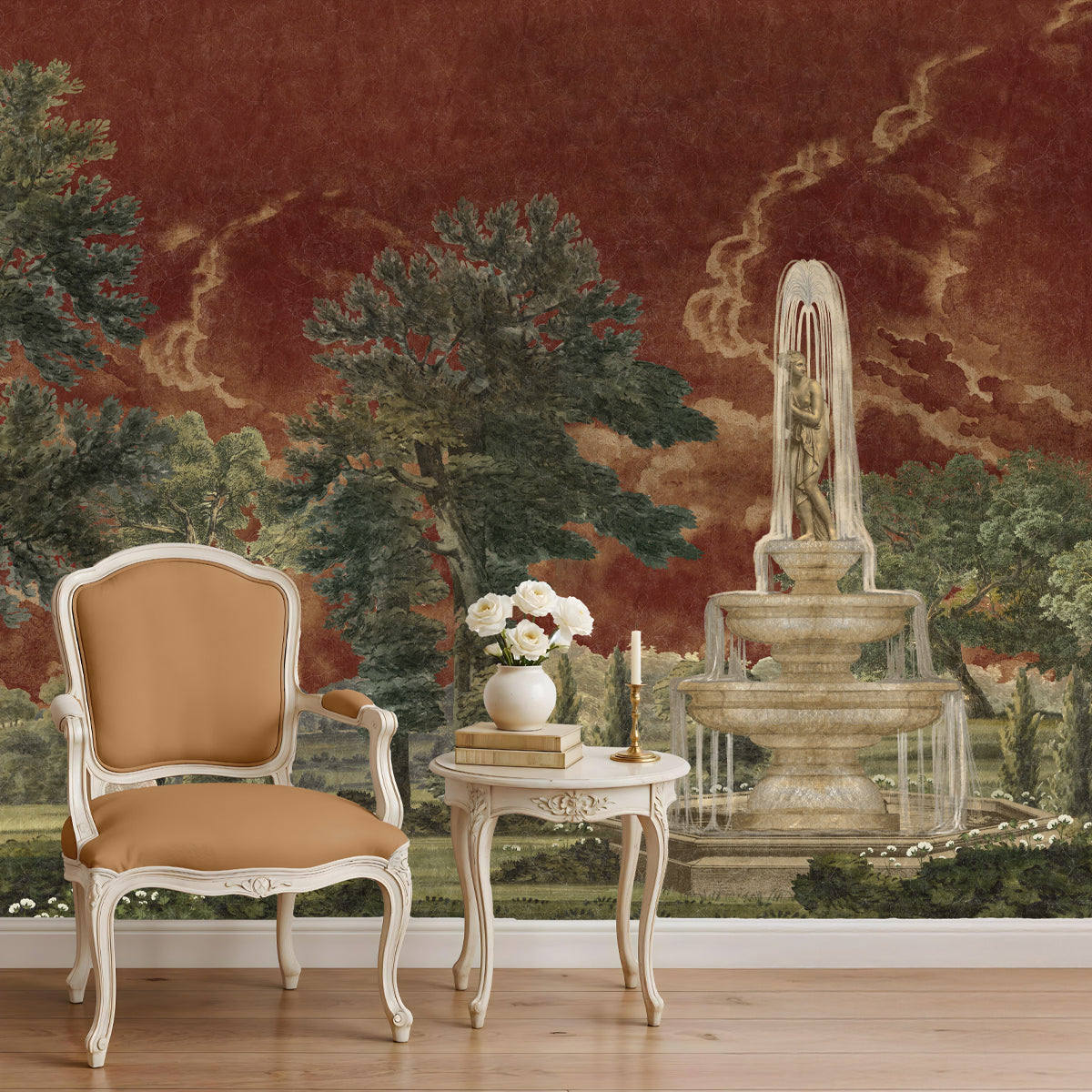 The tiered stone fountain serves as a tranquil centerpiece, The textured backdrop creates the illusion of a preserved Renaissance fresco. Structured elegance contrasting beautifully against the dramatic, fiery horizon creating a rigorous architectural harmony that feels both stately and serene.