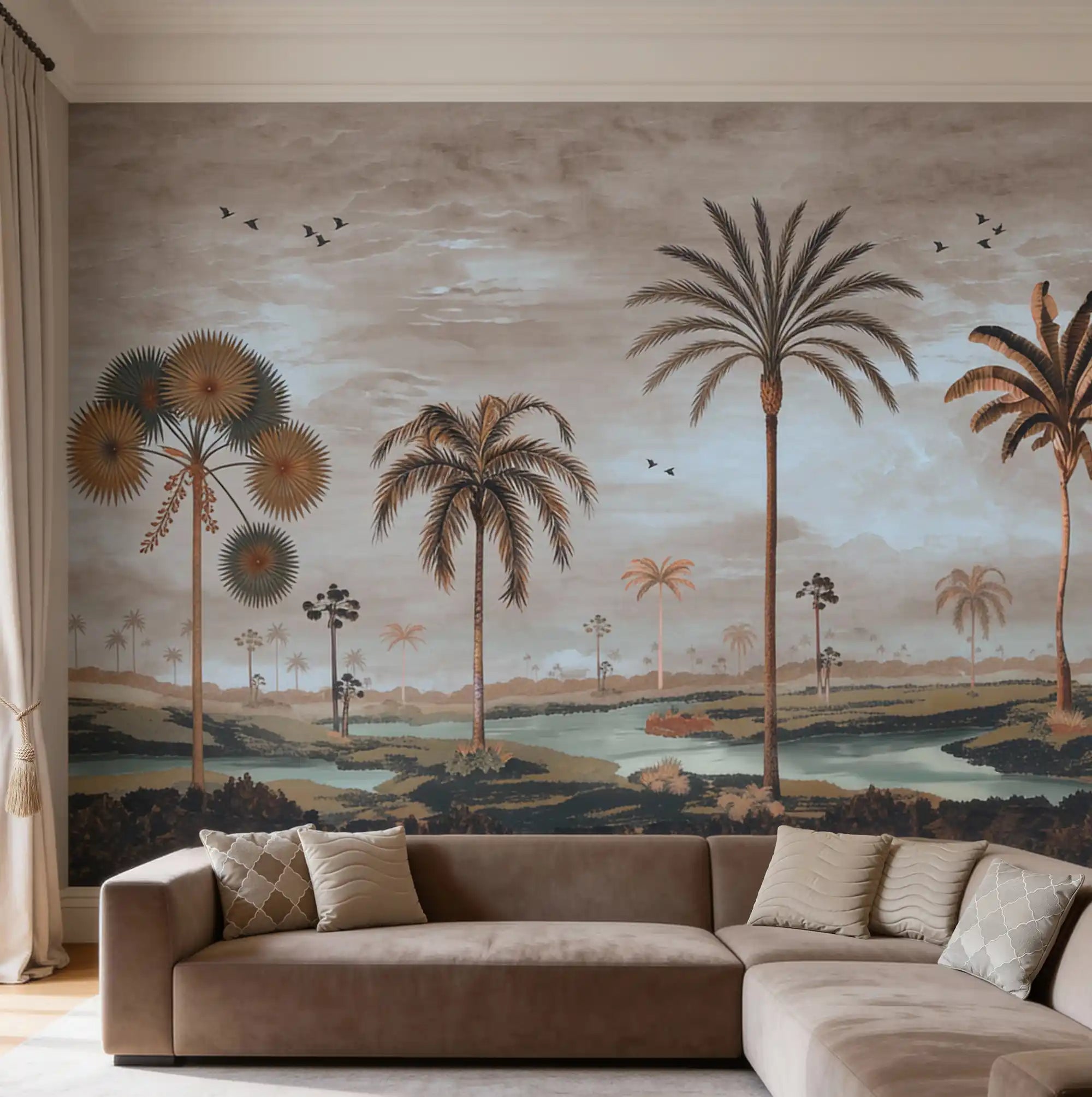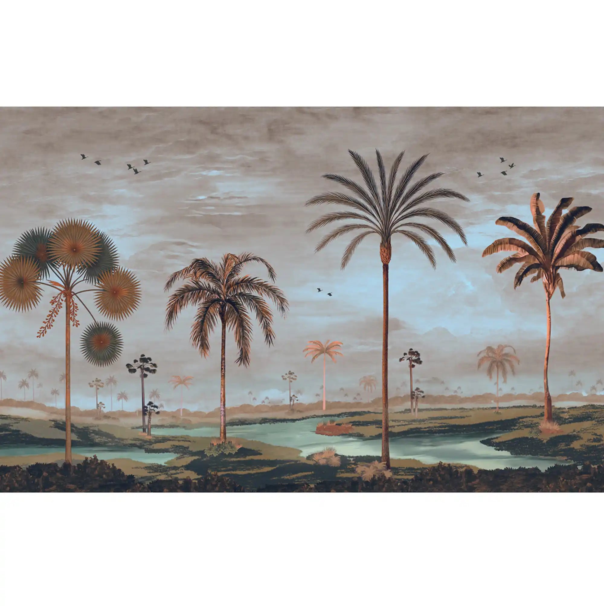 Mosslight Morning captures that quiet breath the earth takes just before the day awakens. Soft mist drifts over tranquil waters, palms stretch gently toward the pale sky, and the first birds trace calm patterns across the horizon. This mural brings the untouched purity of early morning light into any space, a moment where nature feels both ancient and newly born.
