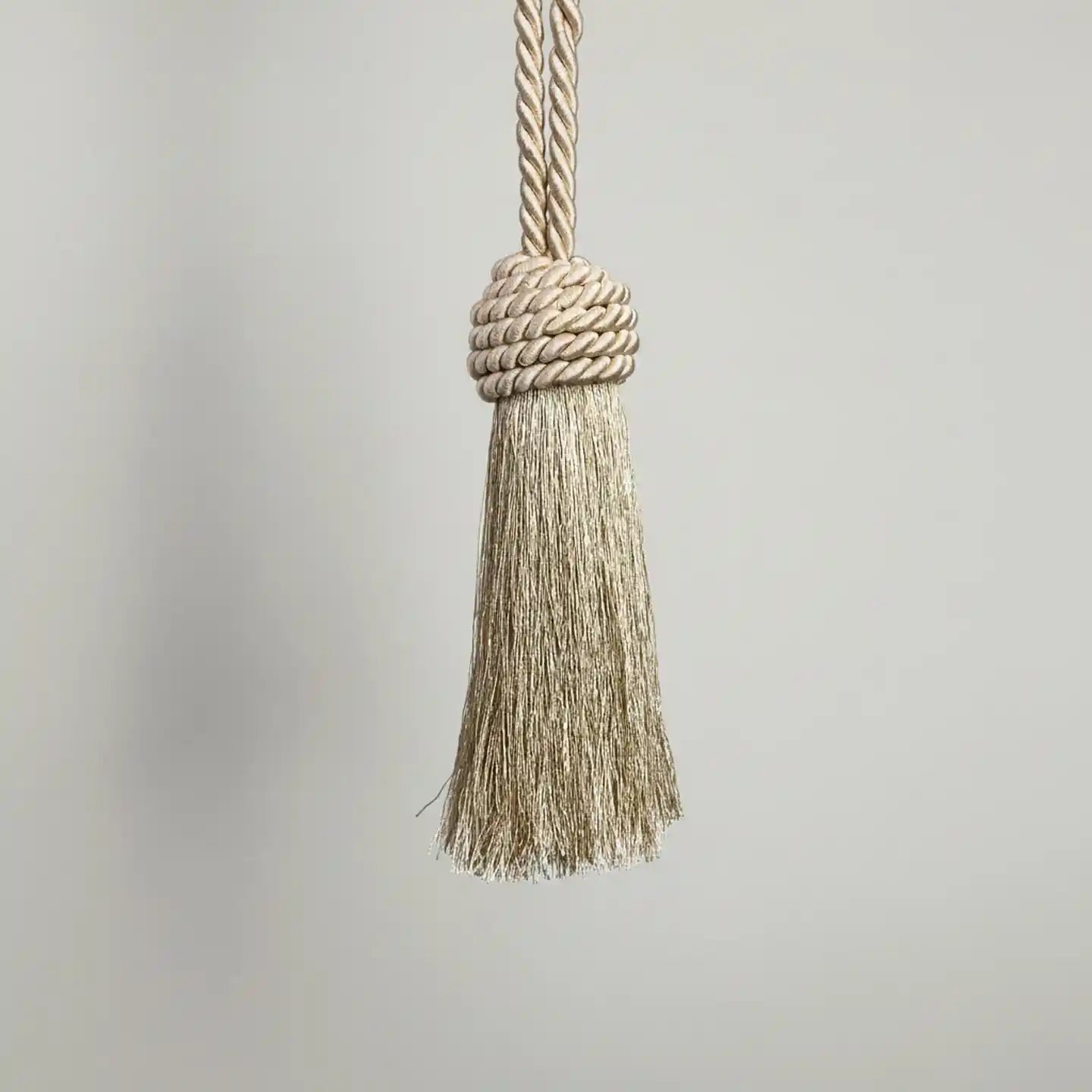 • A timeless statement of elegance, the Frosted Silk tieback is handcrafted from premium, luminous champagne-beige silk cording with a beautifully knotted head. The sumptuous, full-bodied tassel features fine, shimmering threads that mimic frosted silk, catching the light perfectly. This piece serves as a classic, luxurious holdback, adding soft texture and refined sophistication to both traditional and modern drapery.