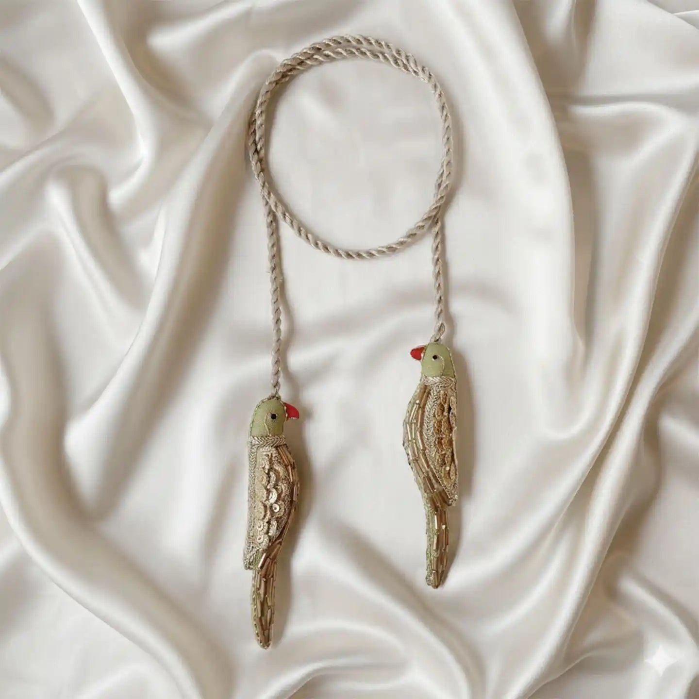 Infuse your living space with whimsical elegance using the Heer Parrot Curtain Tiebacks. Meticulously handcrafted by skilled artisans, these tiebacks feature lush green birds adorned with intricate gold beadwork, sequins, and zardozi embroidery. They are the perfect functional jewelry for your curtains, blending traditional craftsmanship with modern decor.