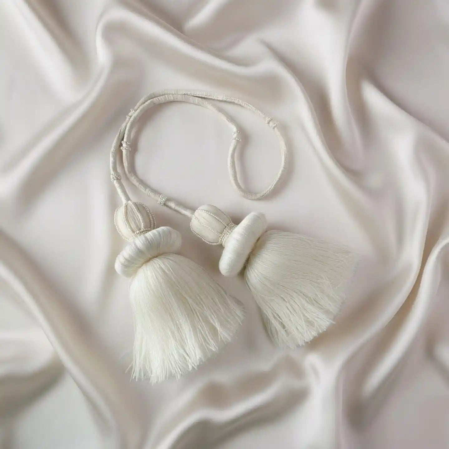 • Exuding unparalleled bridal elegance, the Silkstone tieback features two substantial tassels in a pristine ivory shade, handmade with a striking tiered design. The elegant tassel head is wrapped and topped with a delicate pearl-like beaded crown, adding a touch of sophisticated shimmer. Suspended from a braided silk-look cord, this piece functions as a luxurious holdback, bringing light, texture, and refined opulence to neutral or elegant drapery.