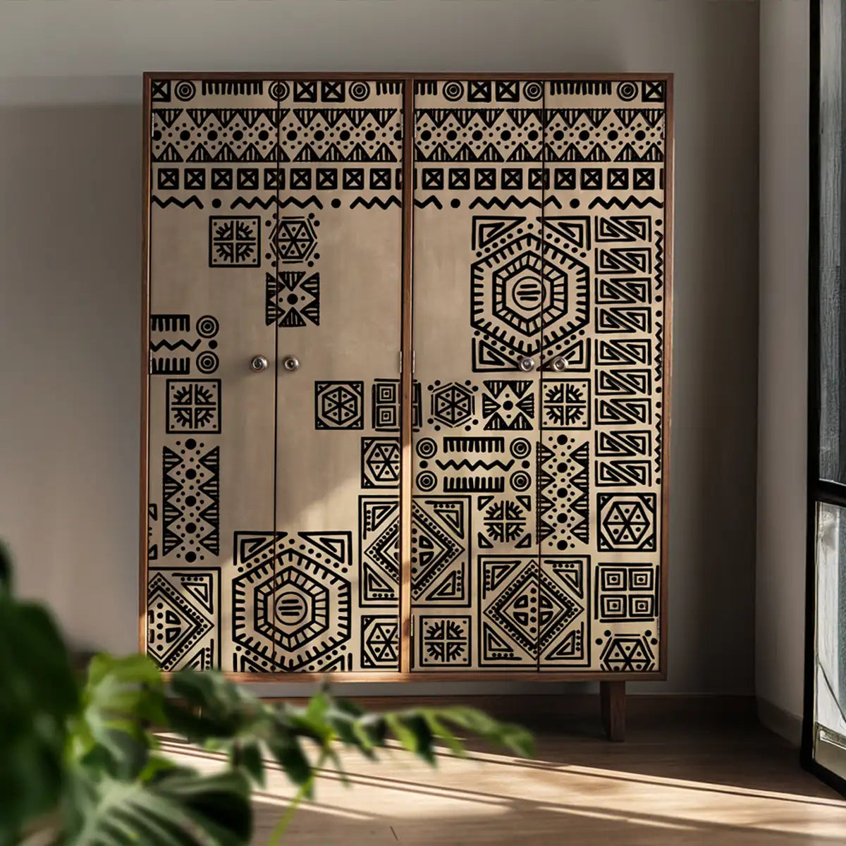 A tapestry of ancestral symbols and intricate geometric forms, this design is an ode to heritage and ritual storytelling, blending symmetry with a contemporary edge.