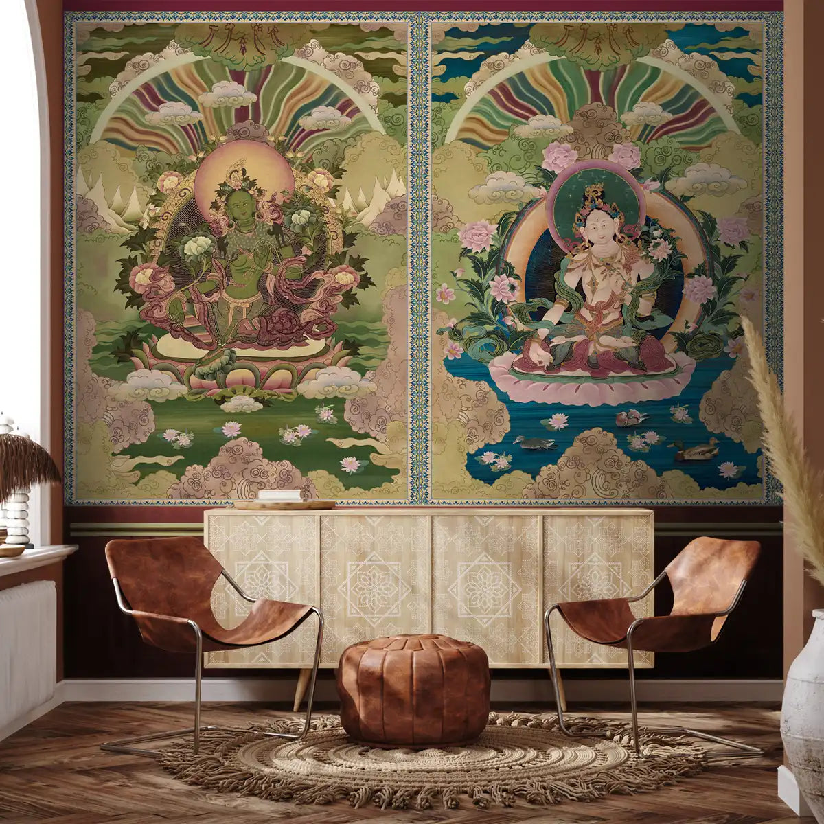 Introducing "Tara, Buddha Wallpaper Design Green and Pink" Inspired by classical Chinese paintings, this exquisite wallpaper features a majestic Buddha bathed in soft light, Creating a calming and harmonious atmosphere in any room.