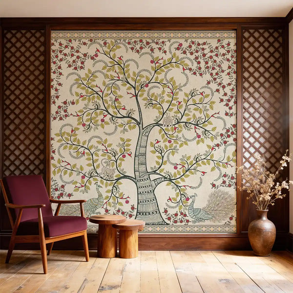 A truly curated room feels layered. We recommend pairing the grand storytelling of our best-selling wallpapers with the tactile textures of our Prasanaakshi fabrics. A vibrant Chinoiserie backdrop, for instance, finds its perfect anchor in a solid, textured velvet chair in a complementary tone.