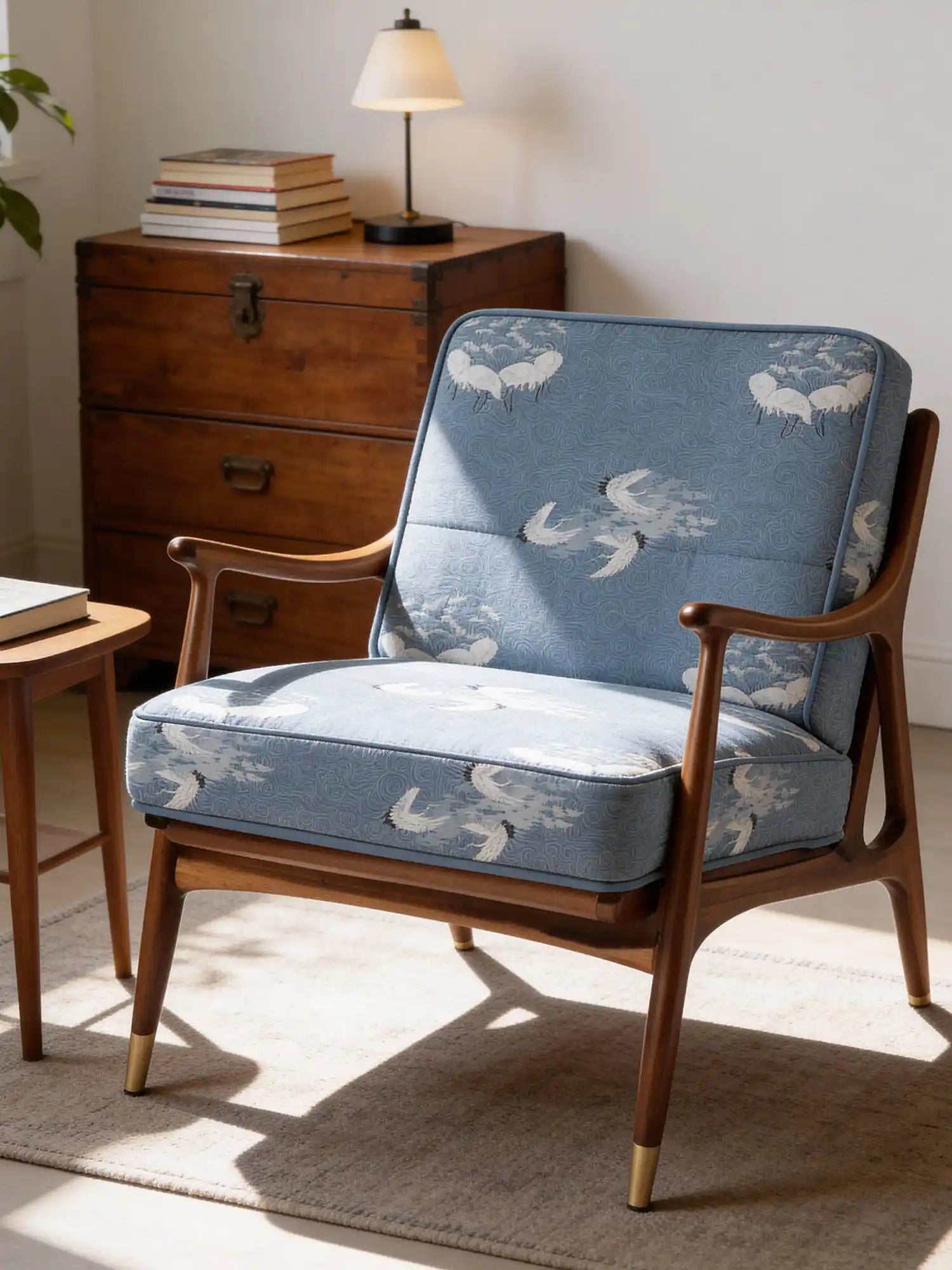 Product Details: Graceful Cranes Sofa and Chairs Upholstery Fabric, Blue & White