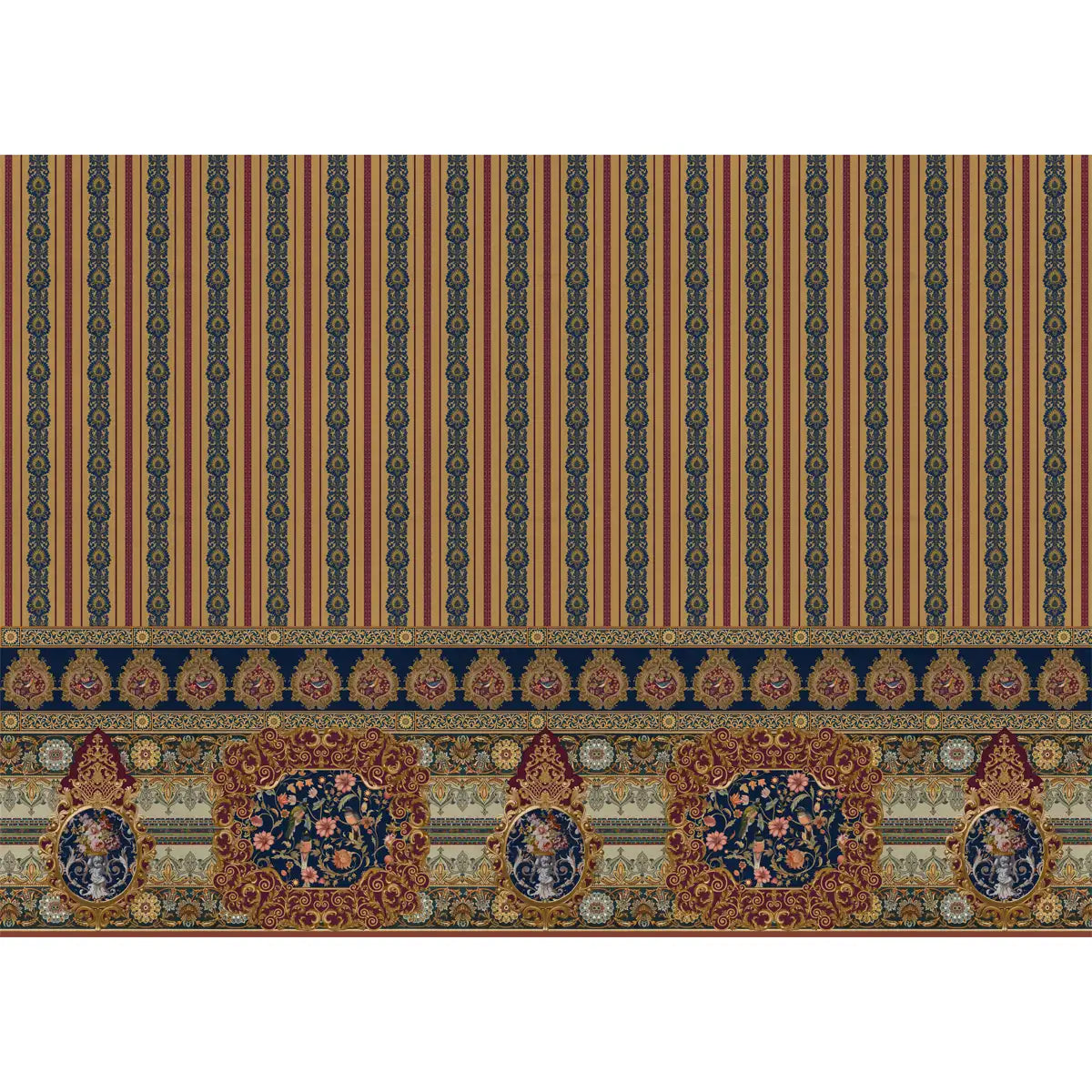 Introducing "Raah Baroque Striped Pattern Wallpaper for an Elegant Room Decor Brown And Blue" Admire the intricate details and cosmic motifs woven into the carpet and strip design.