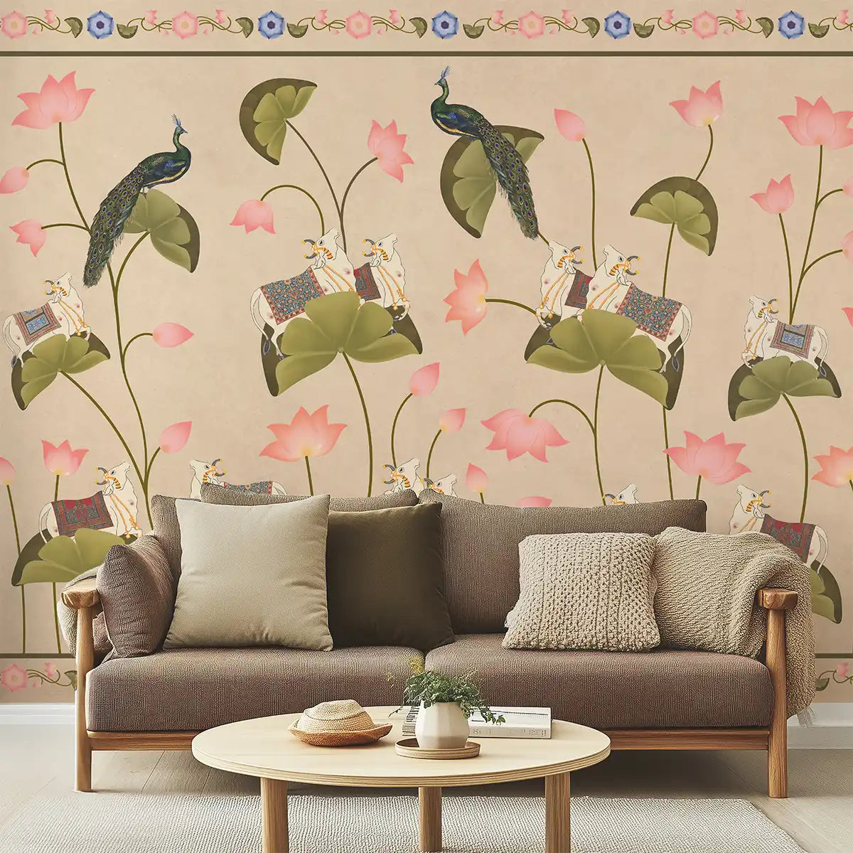 Bring a touch of spiritual artistry to your walls with our Floral Cow Pichwai Wallpaper from Life n Colors. Inspired by the rich tradition of Pichwai paintings, this beautiful wallcovering features premium detailing of a floral cow, making it perfect for your pooja room or a stunning statement wall.