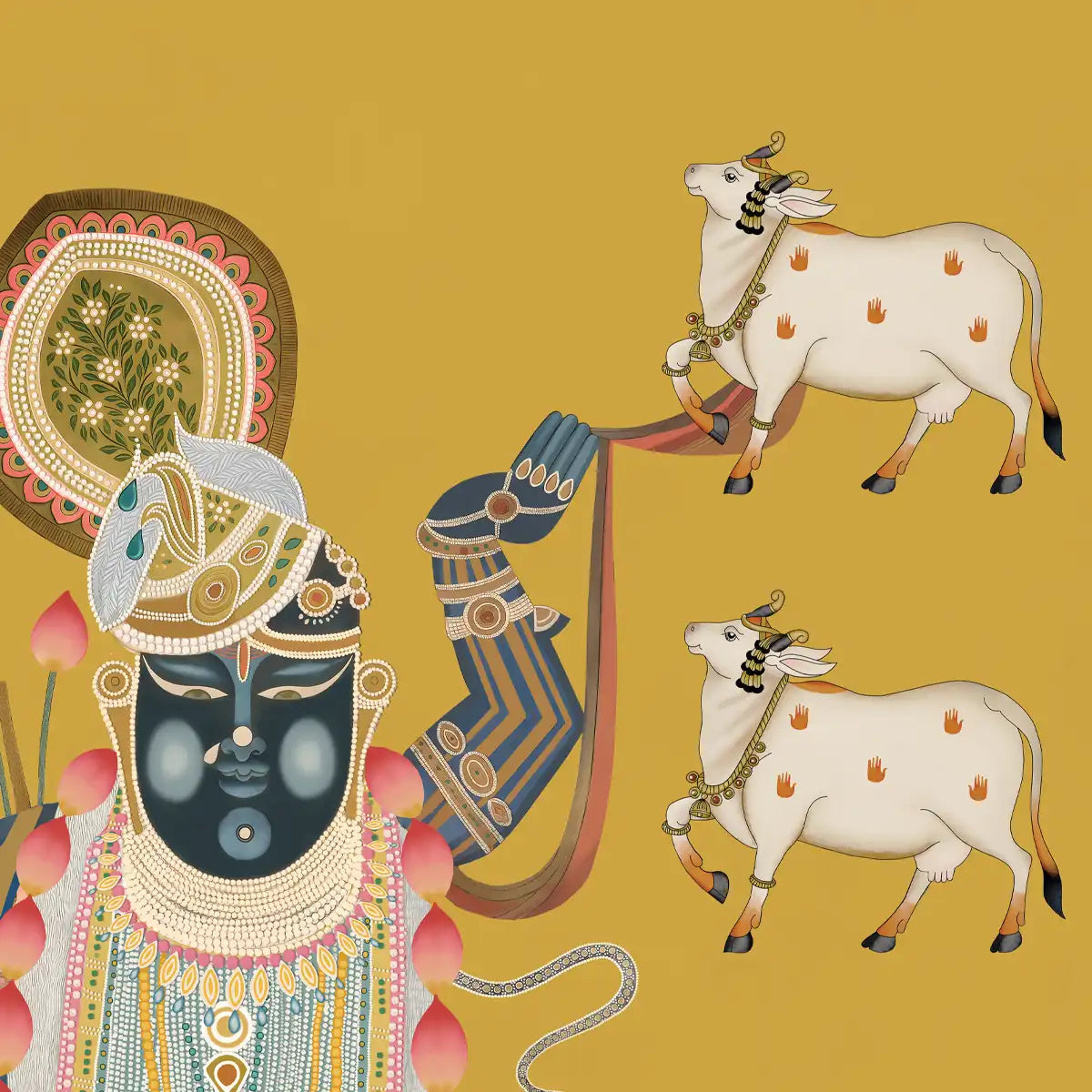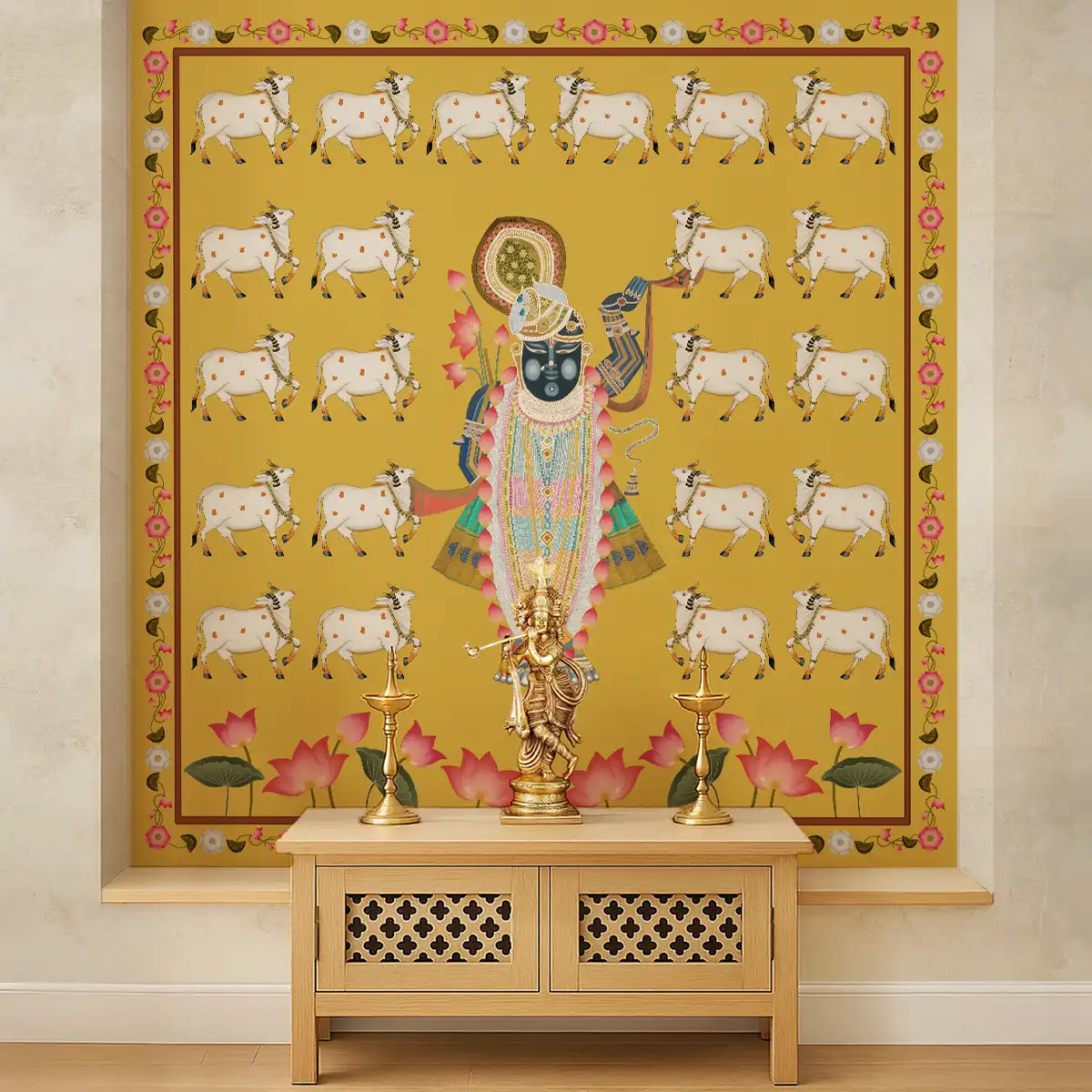 Immerse in divinity with Life n Colors' Pichwai Shrinathji Wallpaper, featuring serene cows and lush lotuses, invoking the essence of sacred Nathdwara art. Yellow Colors, Made in India.