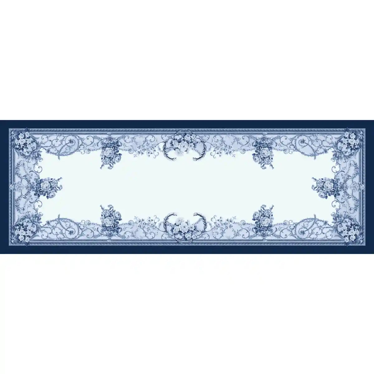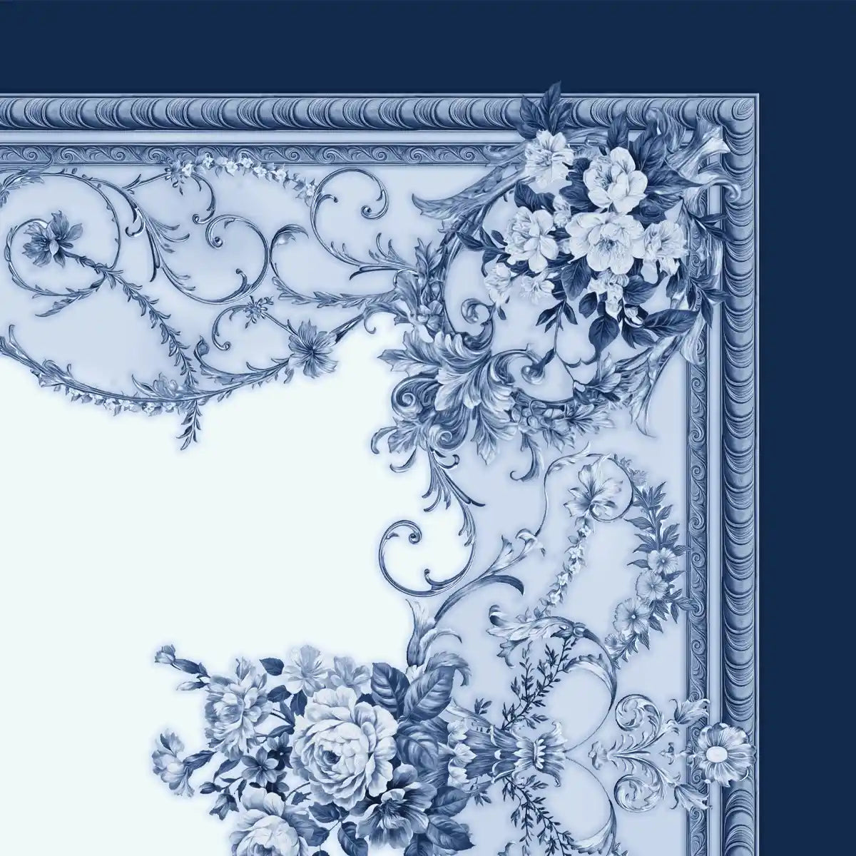 • Introduce breathtaking grandeur to your hallway or entryway with the Aurelia Hall. This luxury mural features a meticulously detailed, Neoclassical Baroque design in an elegant blue and white palette. The ornate border of floral garlands, draped chains, and scrollwork creates a sophisticated, framed illusion, drawing the eye up a narrow space.