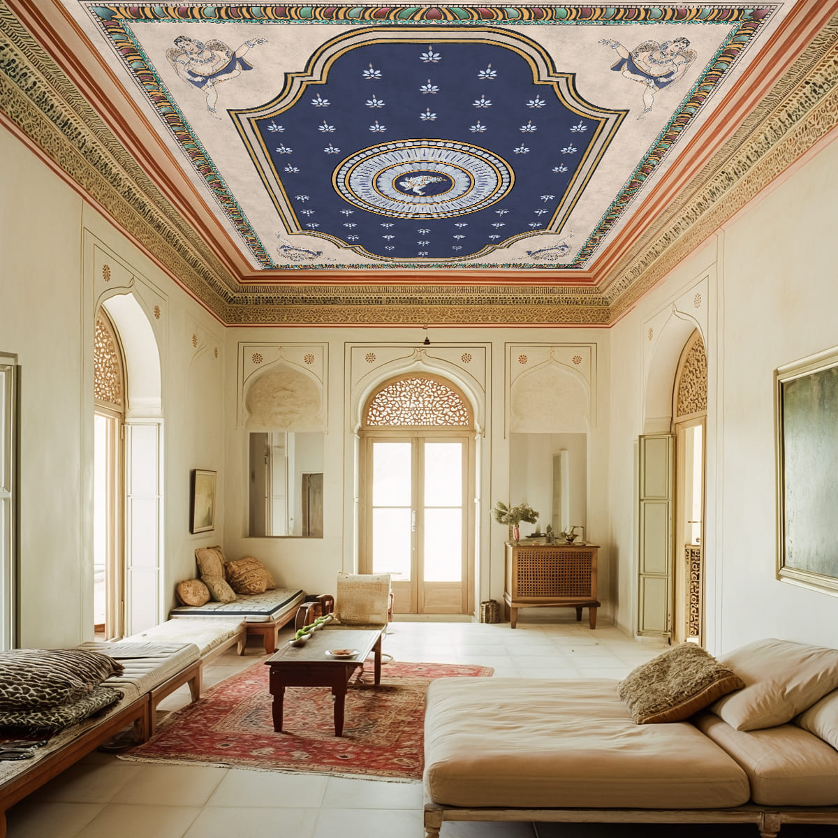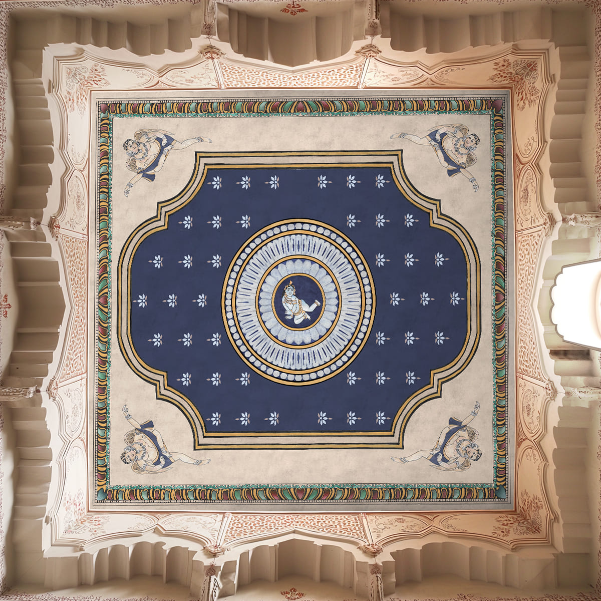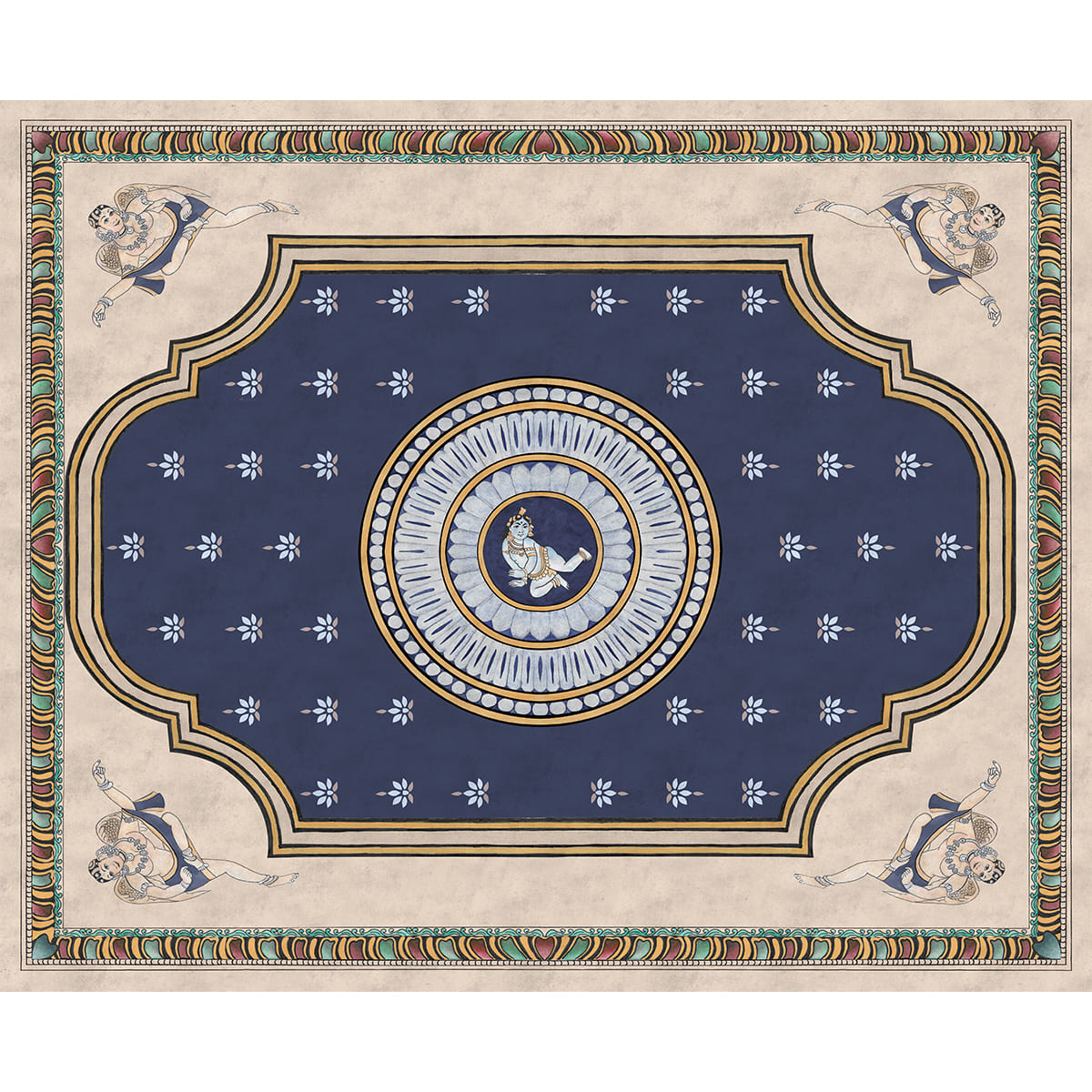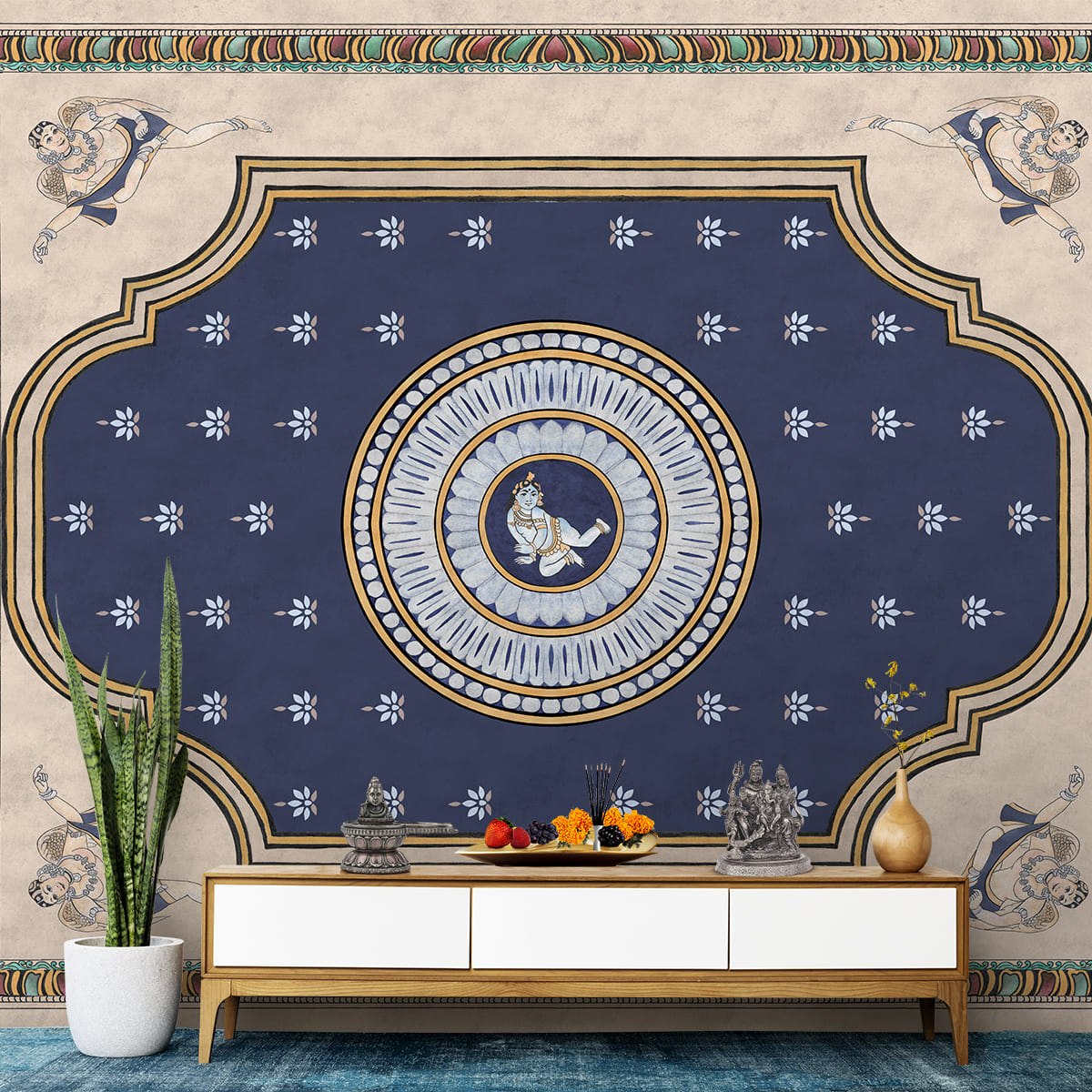 Pichwai Style Blue Wallpaper for Lobby and Temple Walls
