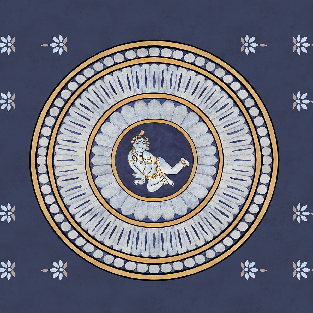 Design your space with the charm of Little Krishna. Surrounded by an exquisite border, this design is a spiritual delight. Traditional buti patterns, creating a mesmerizing frame that adds to the divine allure of Bal Gopal.