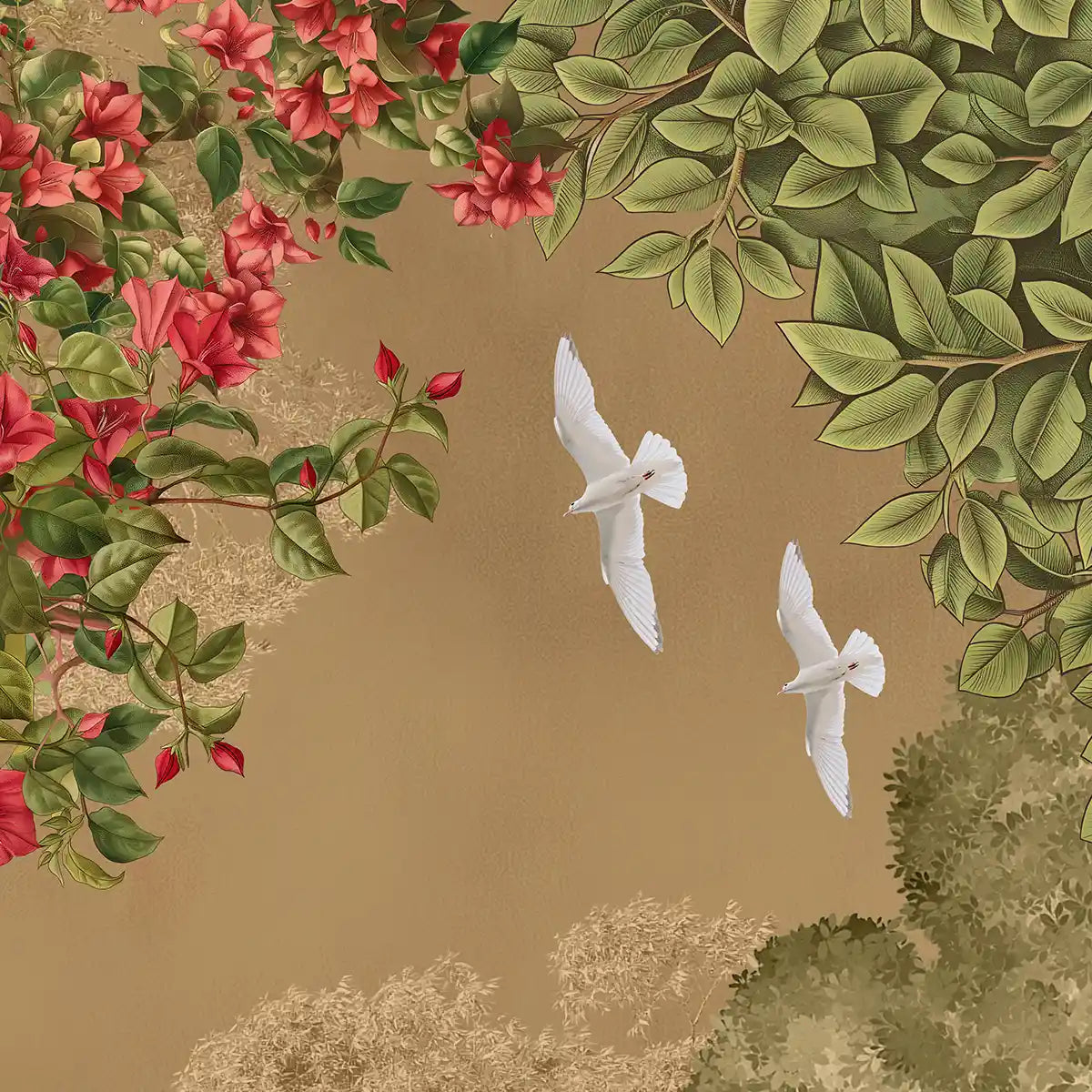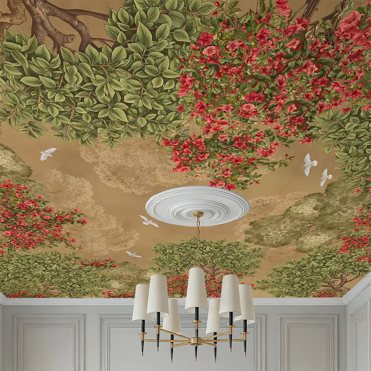 Turn your ceilings and walls into a canvas of natural beauty with our House of Whispers Wallpaper. Designed with lush foliage, blooming red flowers, and delicate white birds set against an earthy backdrop, this wallpaper creates a dramatic yet serene effect. Perfect for feature ceilings, accent walls, or creative interior spaces, it adds depth, elegance, and a sense of enchantment. Whether for dining rooms, lounges, or boutique spaces, this design transforms ordinary walls and ceilings into extraordinary artistic statements.
