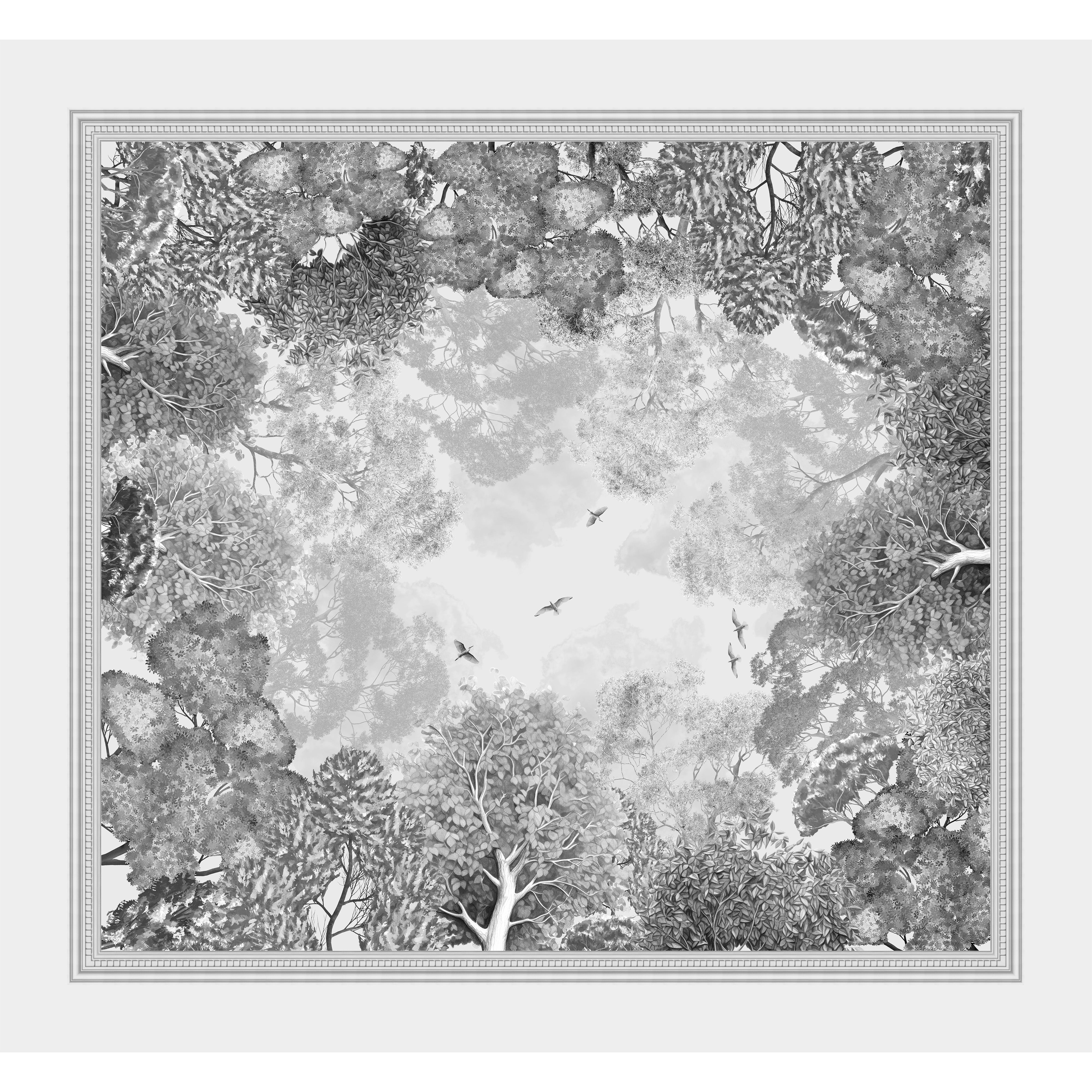 The Shadow Nest mural reimagines the sky as a sanctuary of light and shadow, capturing the immersive perspective of looking upward through a dense forest canopy. Proudly made in India, this design features meticulously detailed foliage and graceful birds in mid-flight, rendered in a timeless grayscale palette that creates a sense of infinite vertical space. This monochromatic masterpiece is an exquisite choice for a grand master bedroom, a high-ceilinged dining room, or an inspired study, bringing the tranquility of the outdoors into your interior architecture.