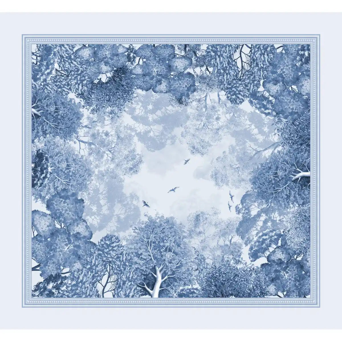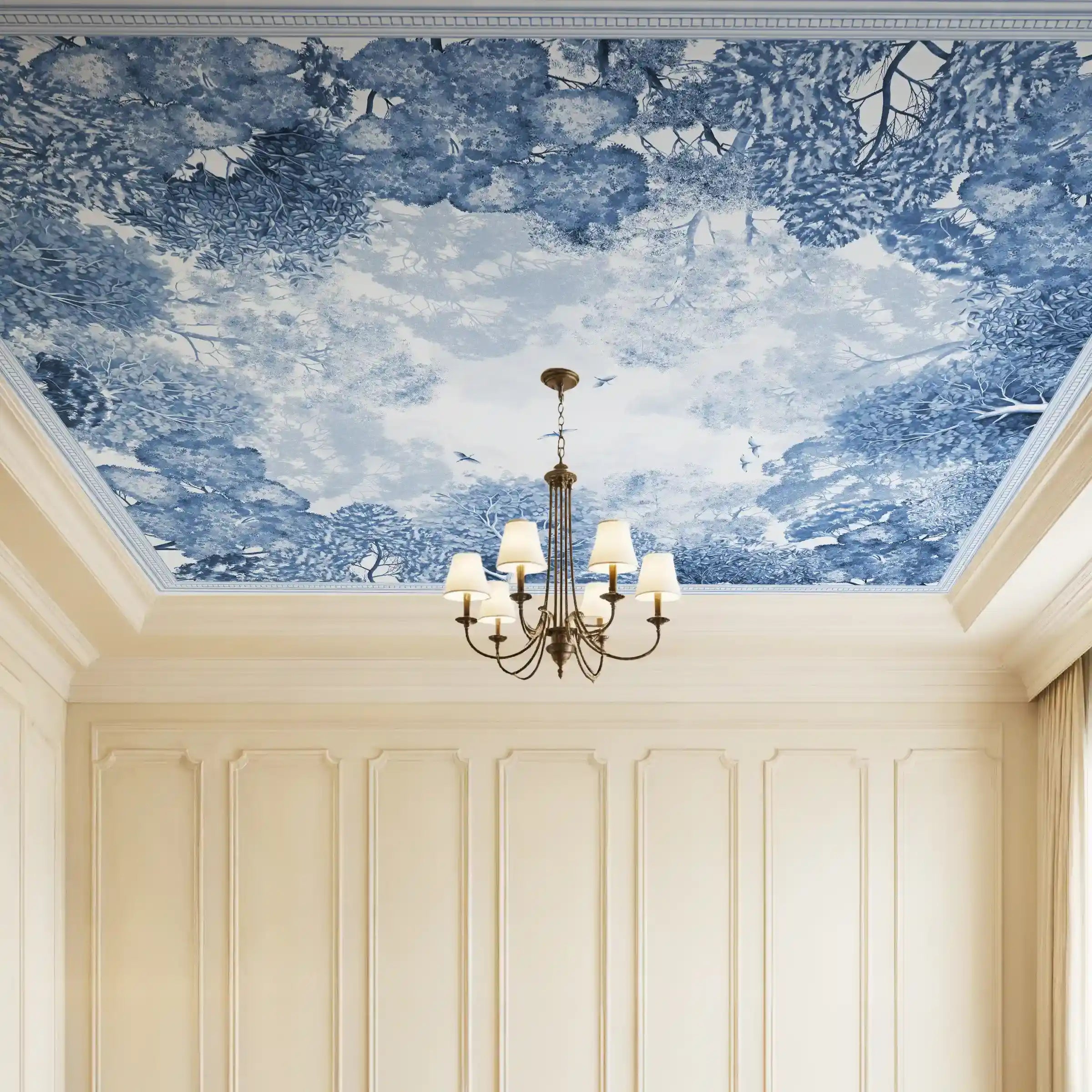 Transform your ceiling into an artistic sanctuary with the Blue Nest Ceiling Wallpaper Mural. This breathtaking mural creates the stunning illusion of looking up through a dense, intricate canopy of trees to the open sky. Rendered in a sophisticated, deep blue and white palette, the detailed illustration features dense foliage and graceful birds in flight, mimicking an antique painted fresco.