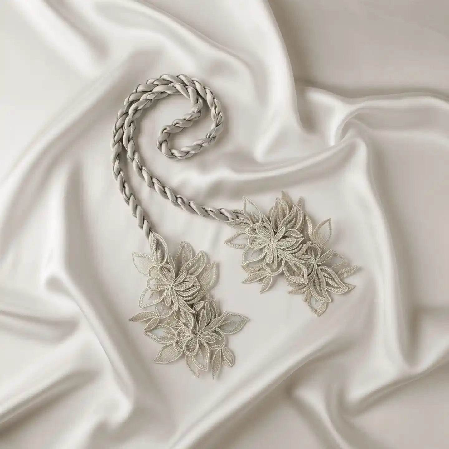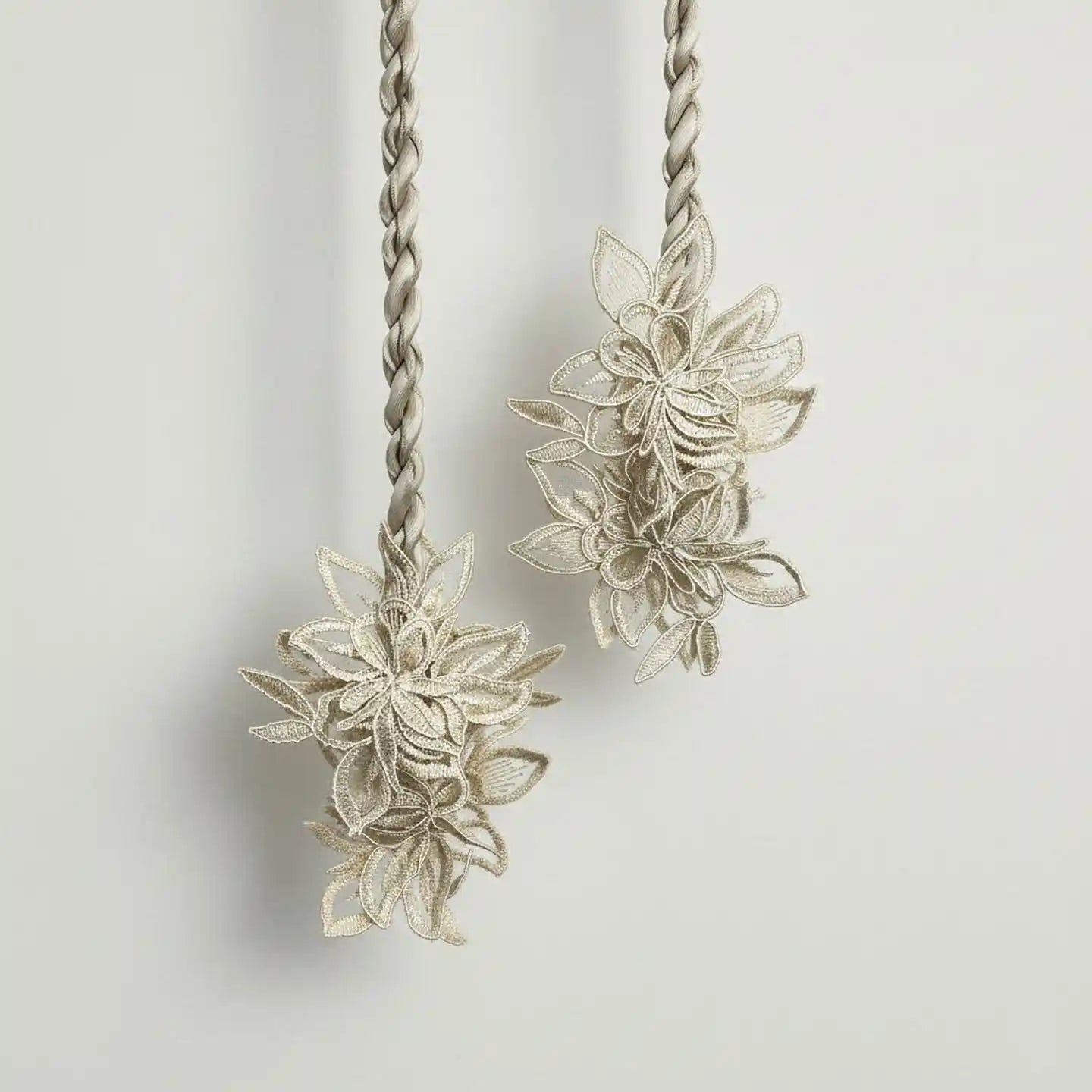 Capturing the delicate beauty of nature, the Ethereal Petals tieback features two clusters of intricate floral lace embroidery finished in a soft, elegant silvery-grey. This artisanal charm is suspended from a premium, thick braided silk cord that elegantly cinches your curtains. Use this exquisite piece as a decorative holdback to introduce unparalleled sophistication and a whisper of romance to any room.