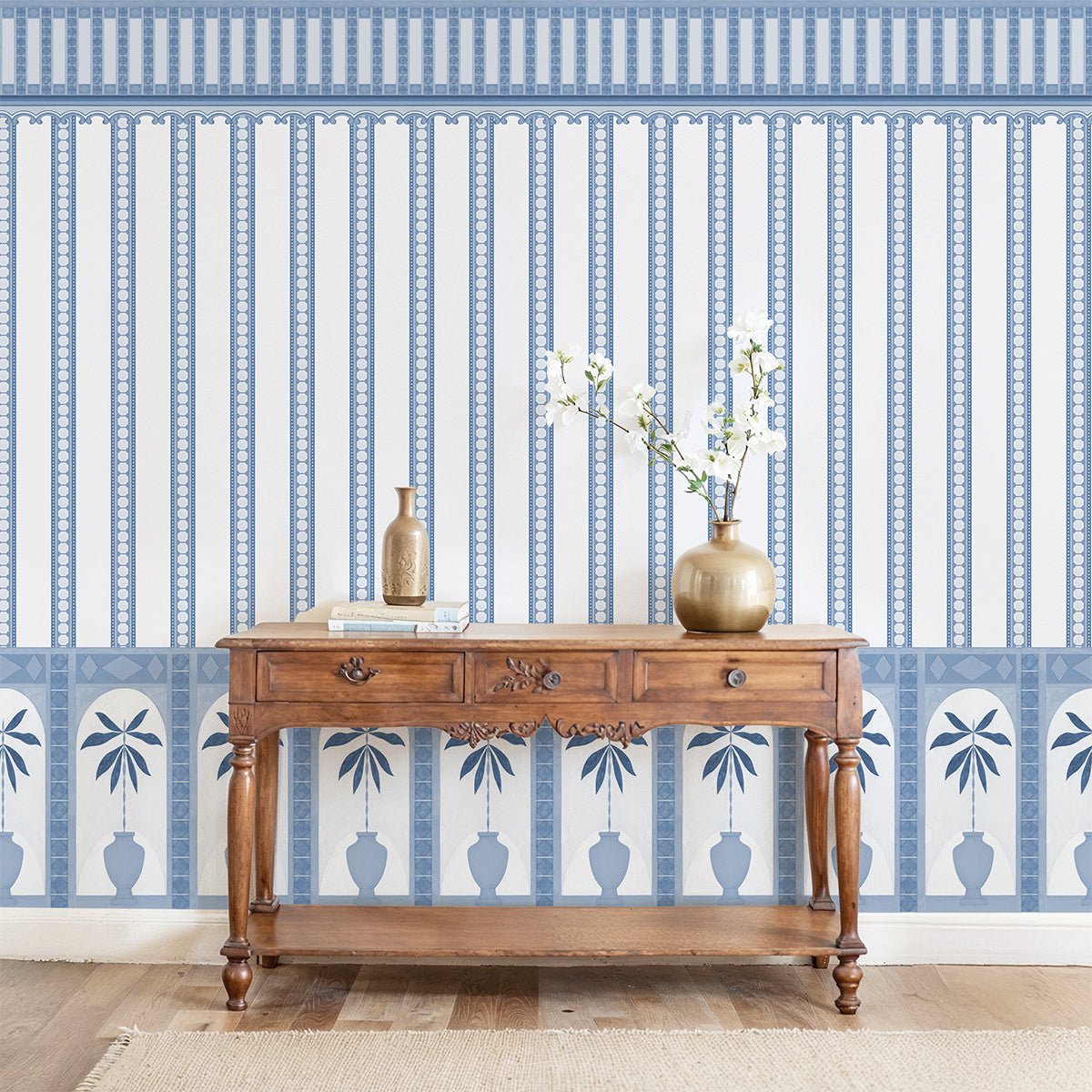 Rendered in a crisp blue and white palette, this wallpaper is perfect for creating a bright, elegant feature wall in an entryway, living room, or formal dining space.