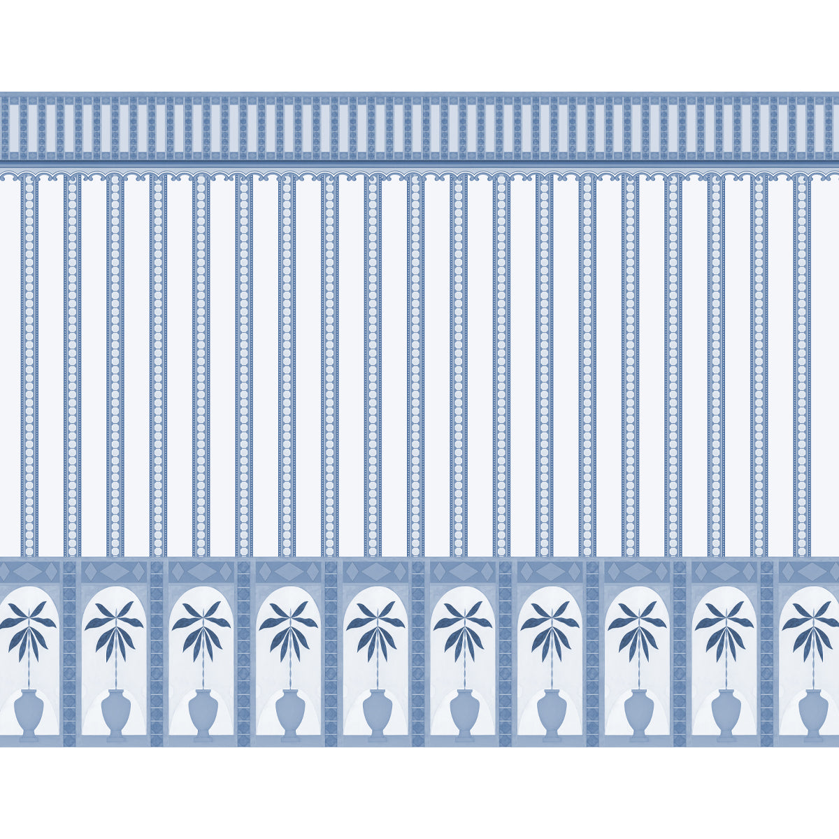 Achieve a bespoke, architecturally inspired look with the Monsoon Arches Stripes. This unique decorative wallpaper features a repeating pattern that expertly blends three elements: a refined field of vertical stripes, a stately top border, and a dramatic lower border. The lower border showcases stylized palm plants set within decorative arches and vases, giving the wall a sophisticated, custom-paneled effect.