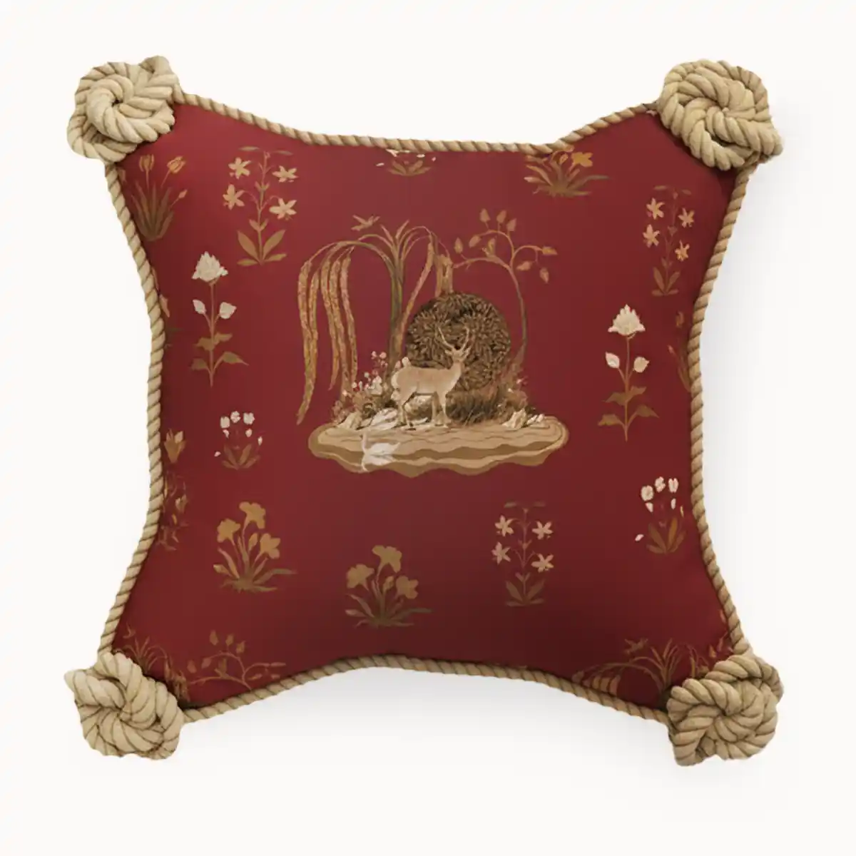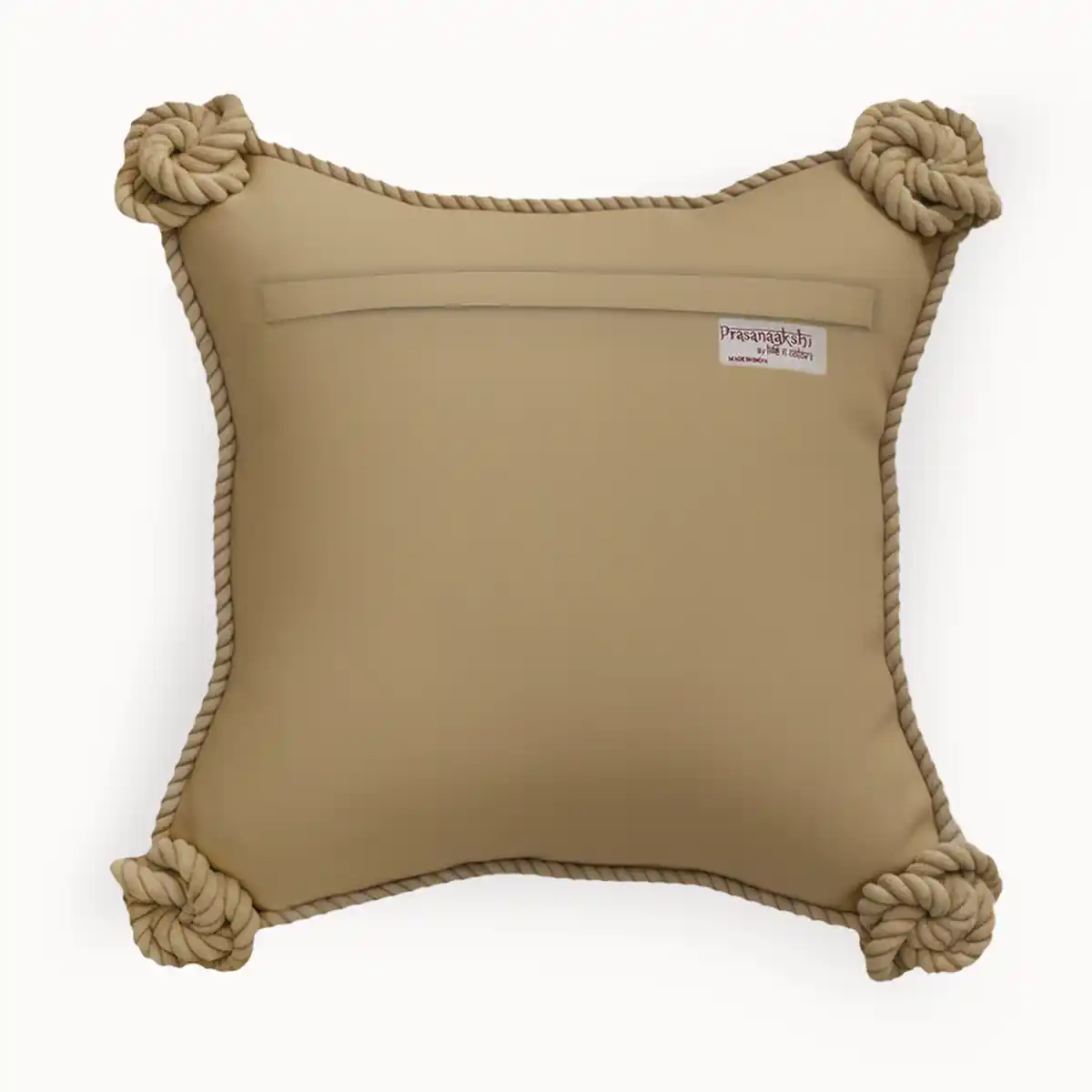 Bring understated elegance to your décor with the Malhar Rustic Corner Cushion Cover. This cushion highlights a traditional maroon base adorned with delicate golden floral motifs. Finished with chunky knotted rope details on each corner, adds depth, warmth, and a touch of modern luxury to sofas, chairs, or beds.
