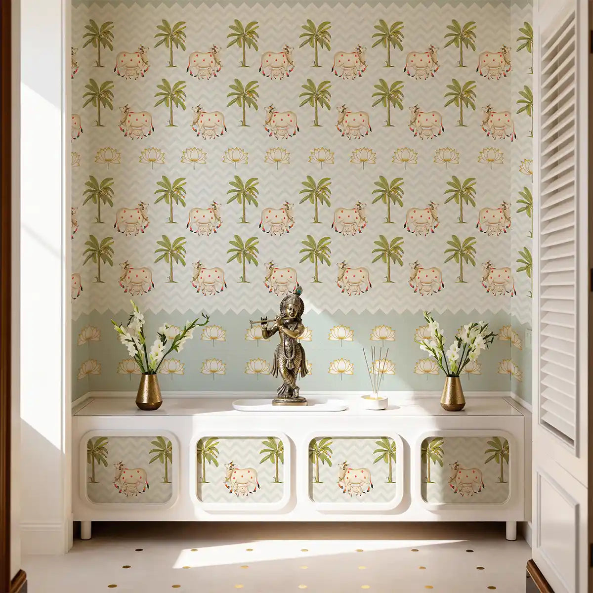 Pichwai Cows in Chevron Pattern Wallpaper for Pooja and Living Rooms