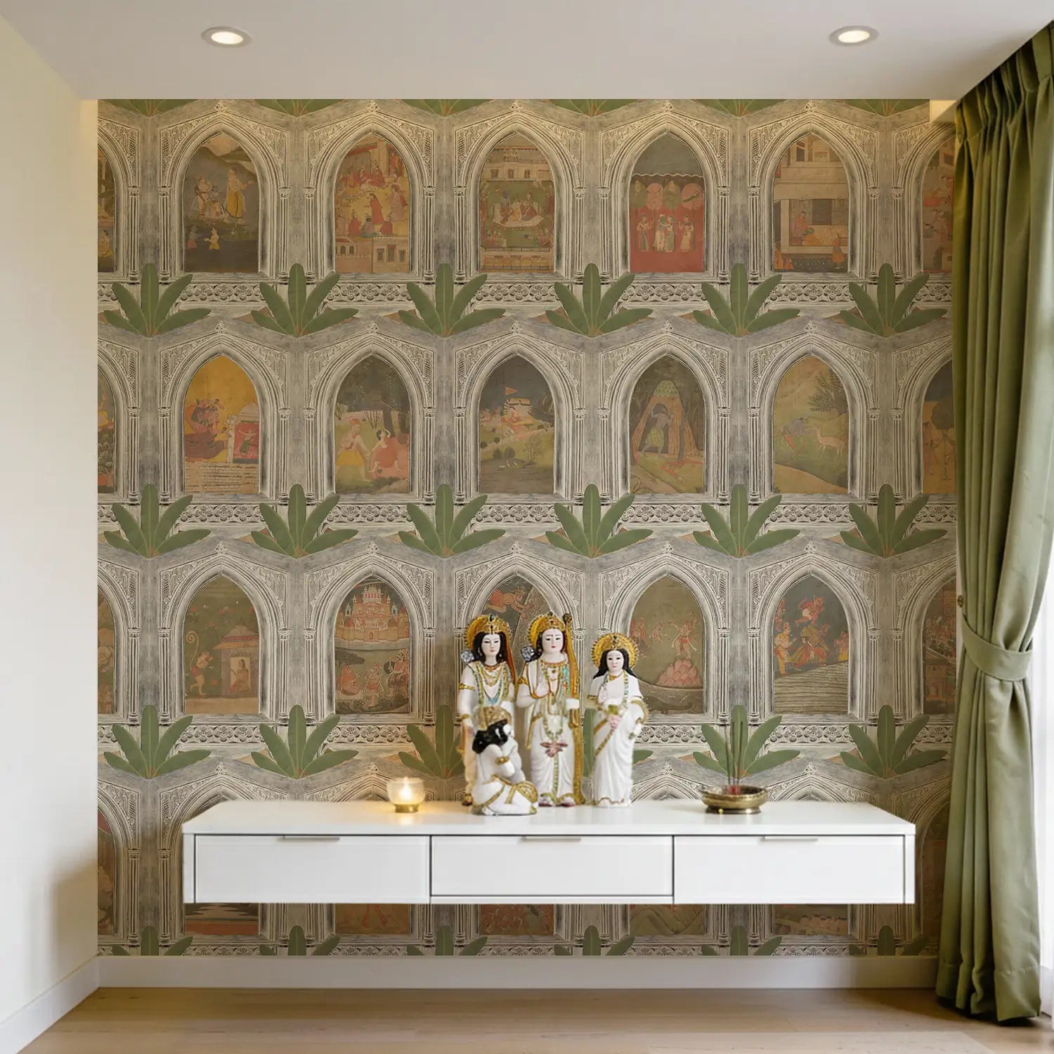 Inspired by the Ramayan, this wallpaper features divine jharokha artistry. Luxurious finish, intricate motifs, and perfect for pooja or living rooms.