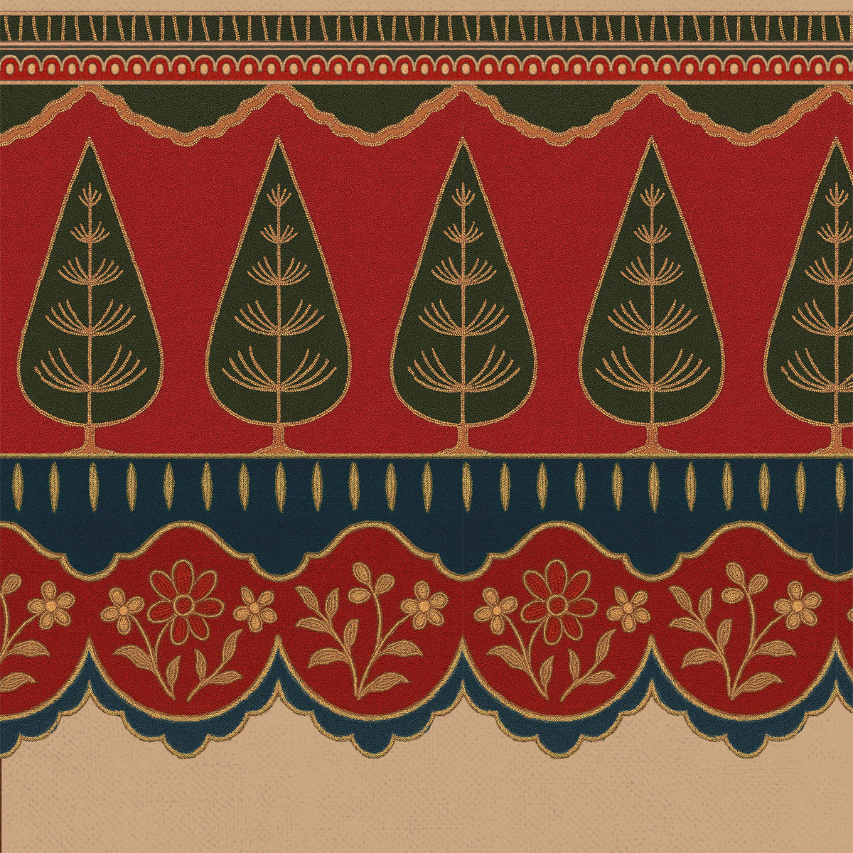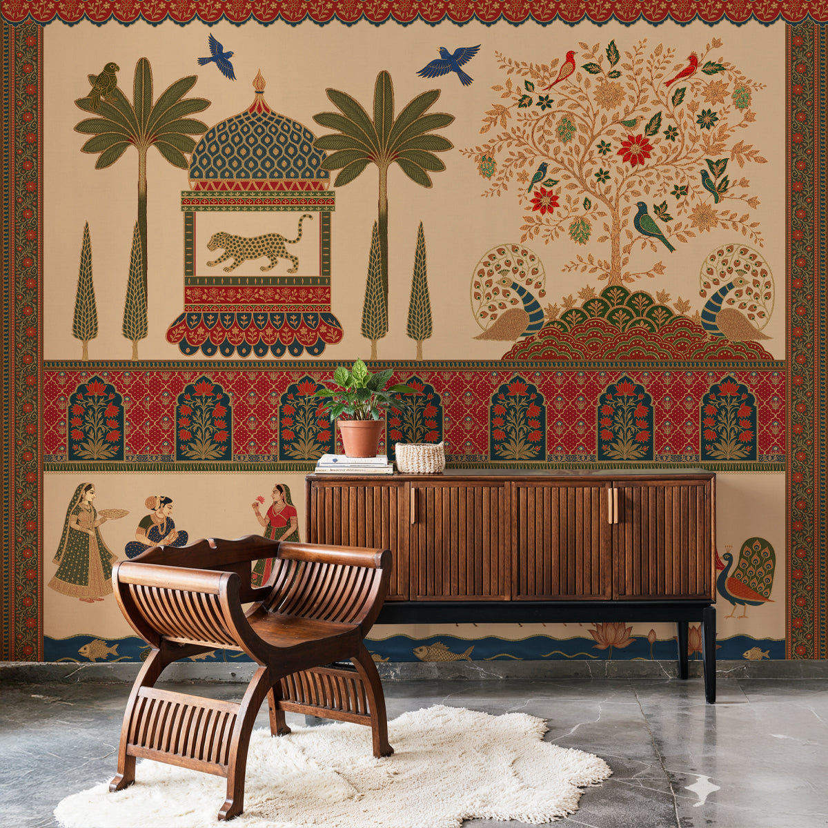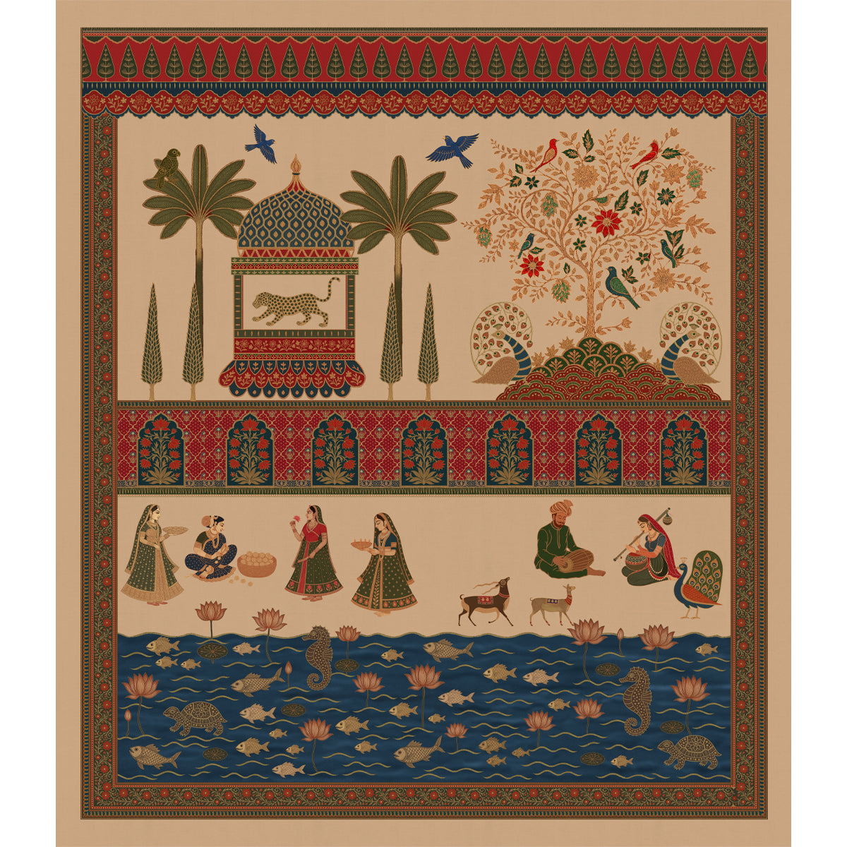 Inspired by the opulence of silk sarees, this design weaves the grandeur of a royal courtyard into a zari tapestry. Musicians, dancers, and peacocks evoke festivity, while the lotus pond and Tree of Life symbolize abundance and heritage. With its silk-like sheen and saree-inspired borders, it brings elegance and cultural richness to life.