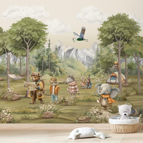 Animal Jungle Camp Wallpaper: This playful design features a whimsical jungle camp filled with adorable animals, perfect for fostering a sense of adventure and exploration.