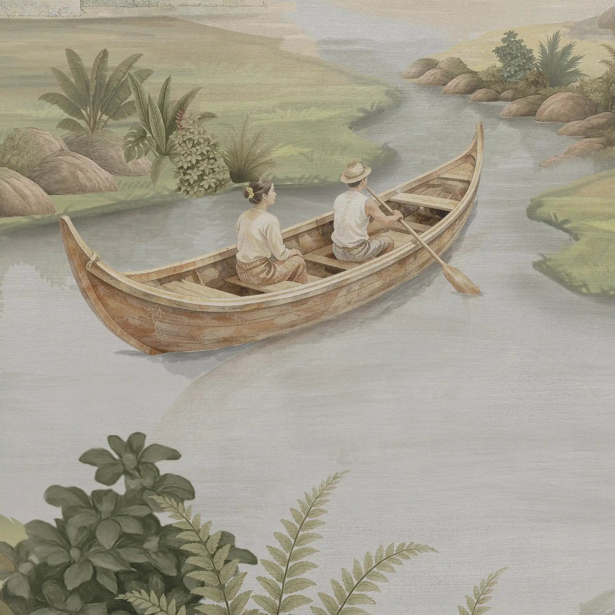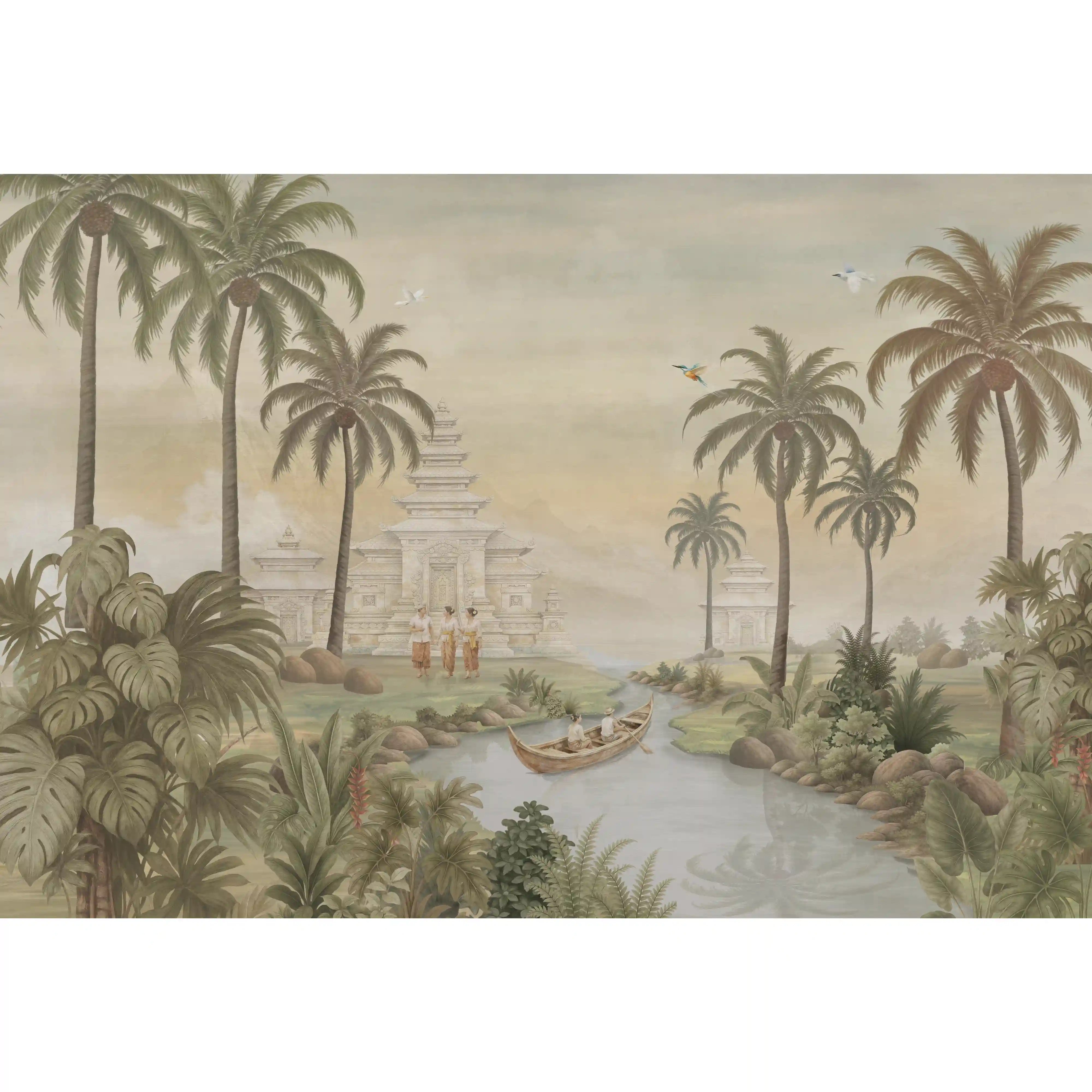 Island of Sanctuary captures the serene beauty of a tropical paradise, where graceful palms, a tranquil river, and majestic temple architecture create a peaceful escape. Soft earthy tones and muted greens bring warmth and calm, while delicate details add depth and storytelling.