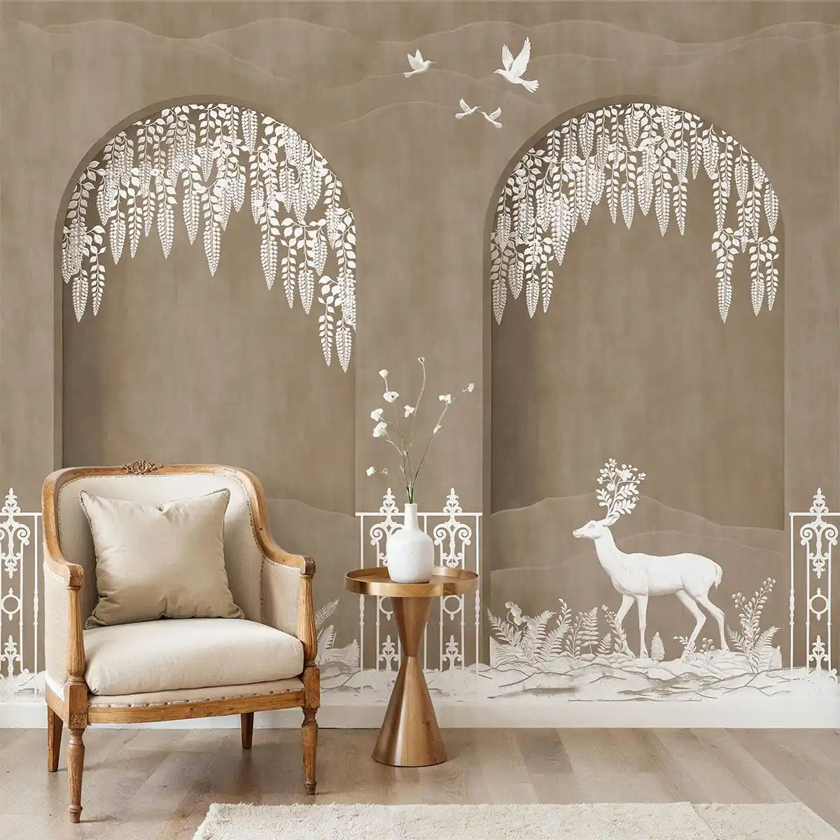 Create a magnificent focal point with the Neel Upvan Sepia. This dramatic, full-wall mural immerses your room in a stylized sepia fantasy landscape. The deep, vibrant sepia background sets off intricate white sketches of a peaceful garden, featuring weeping flowers hanging from graceful arches, a majestic deer, and a quiet feline figure in the foreground.