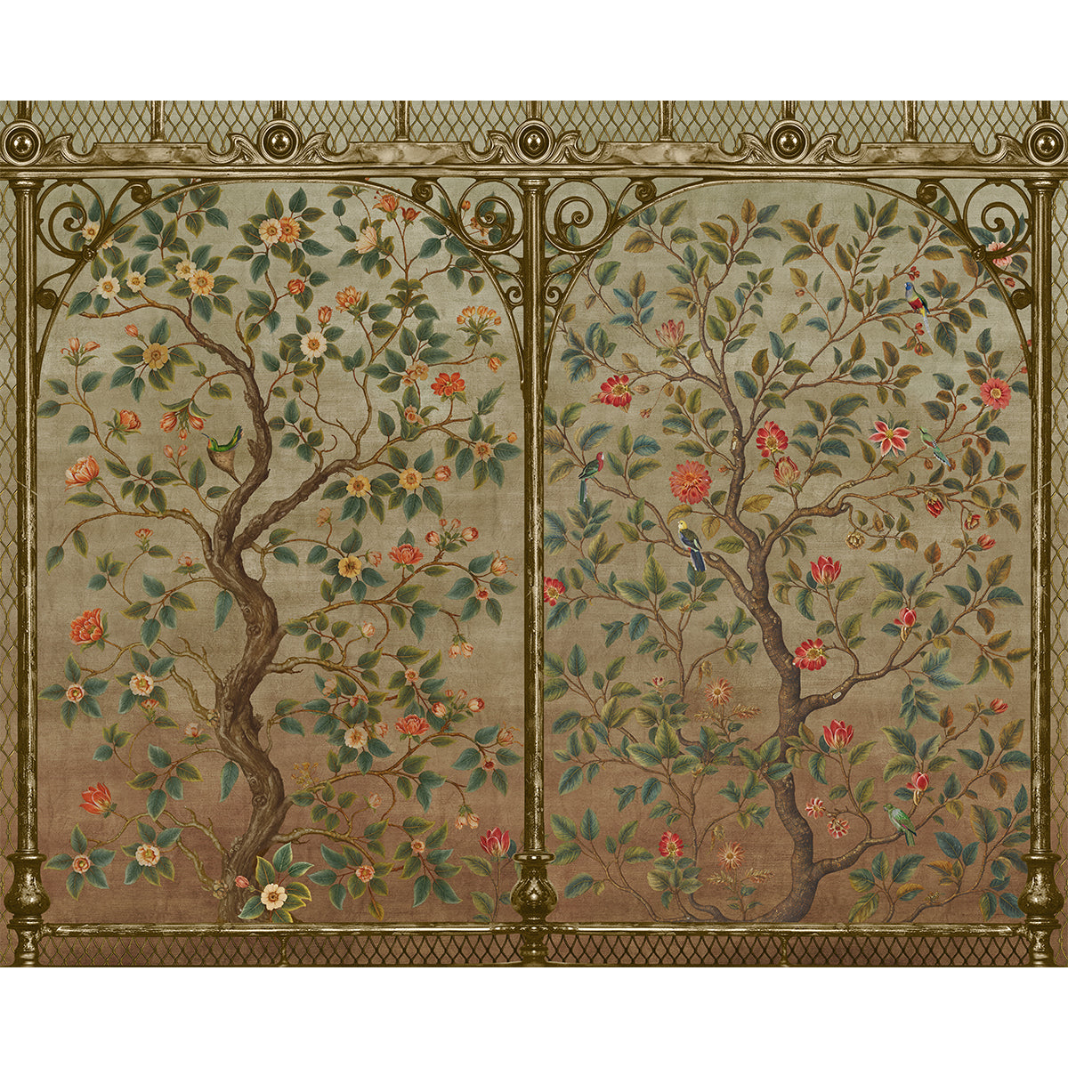 Immerse your living room or bedroom walls with our exquisite Royal Garden Chinoiserie Wallpaper from Life n Color, offering timeless elegance and a luxurious garden aesthetic. This captivating room wallpaper features intricate flowering trees and golden panels, creating a serene, sophisticated statement for any space.