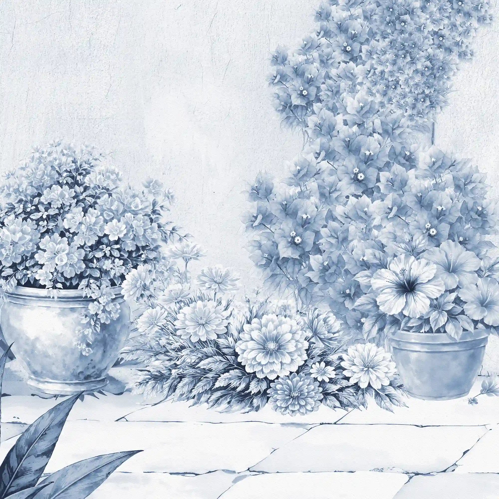 Lush foliage, flowering vines, and potted plants frame the rustic courtyard, while textured walls and stone flooring add authenticity and warmth. The soft tonal treatment gives the design a refined, artistic feel — reminiscent of hand-painted ceramic murals.