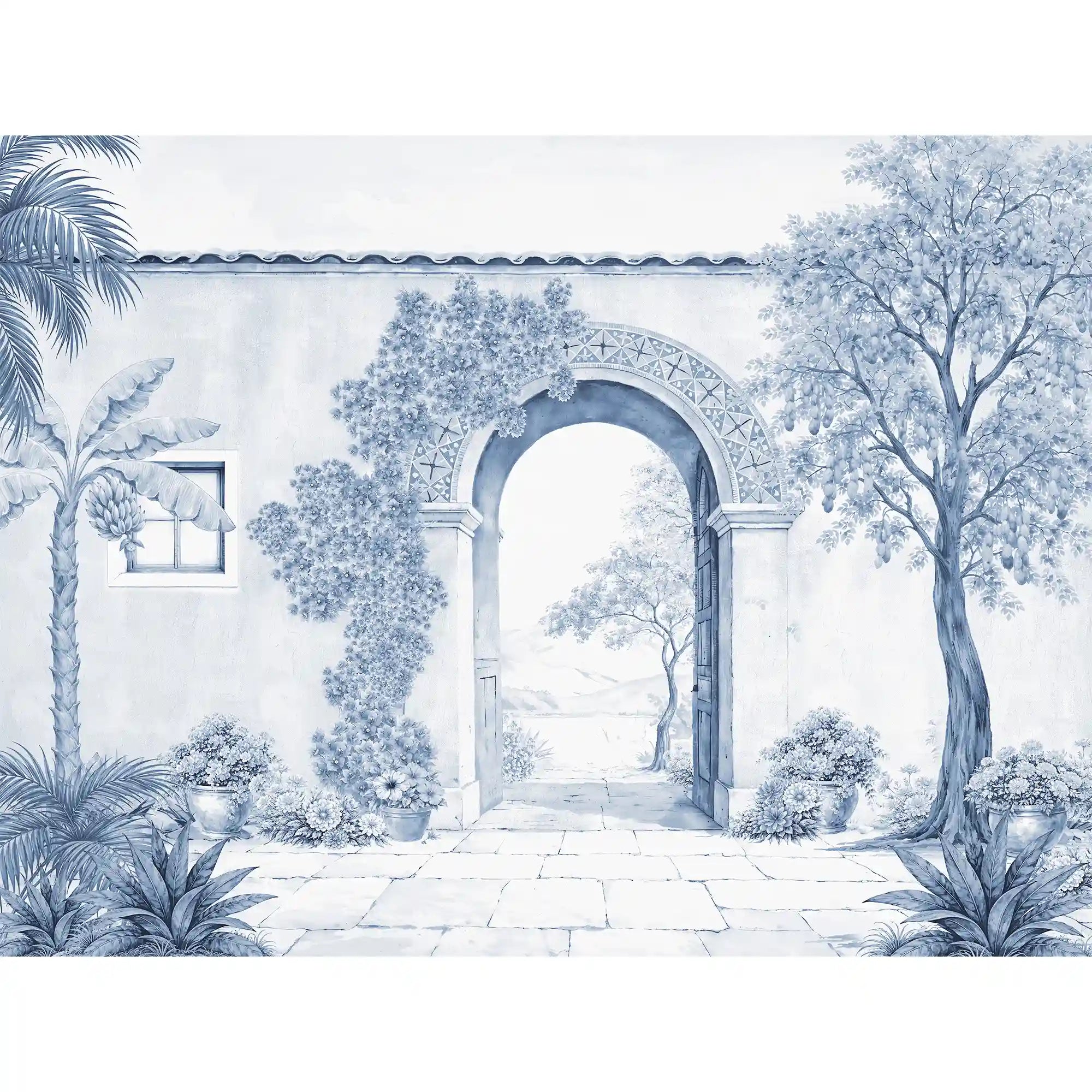 The Silent Portico captures the timeless charm of Mexican architecture through a serene, monochromatic blue palette. A graceful arched doorway adorned with intricate tile detailing opens into a tranquil landscape beyond, creating a sense of depth and quiet escape.