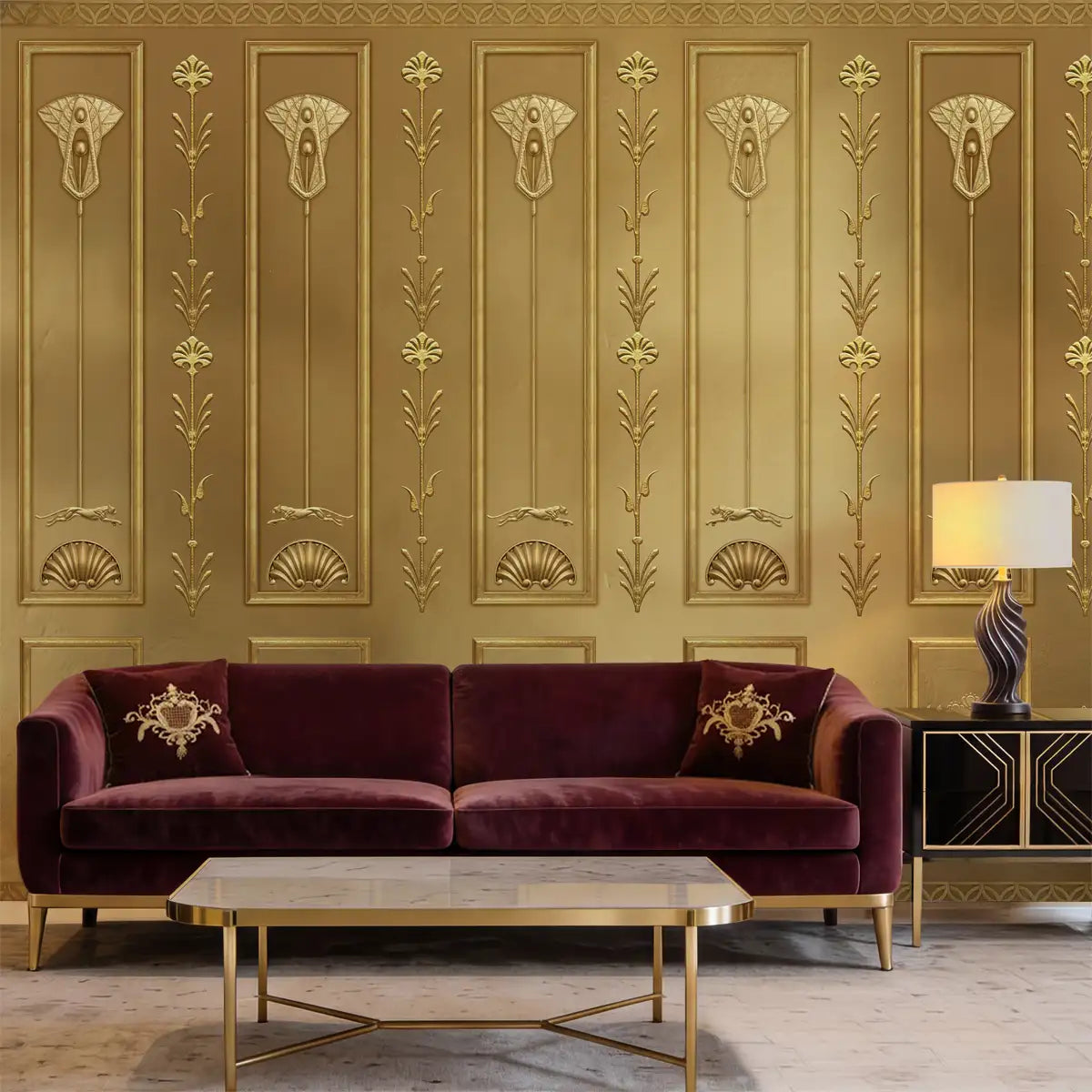 Echoing the opulent spirit of the Art Deco era, this design features structured geometric panels that shimmer with a metallic golden glow, creating a setting that feels both historic and radiantly modern.