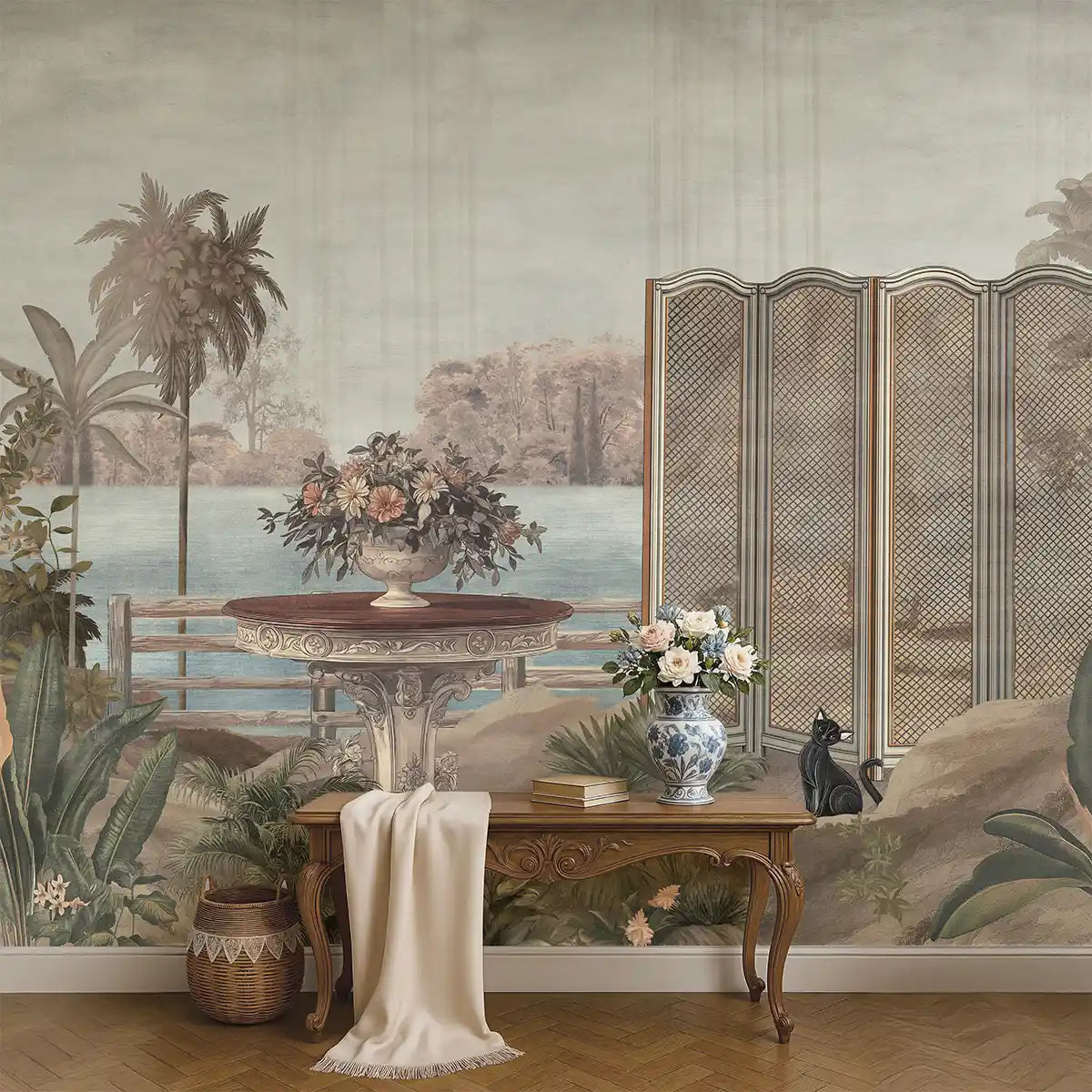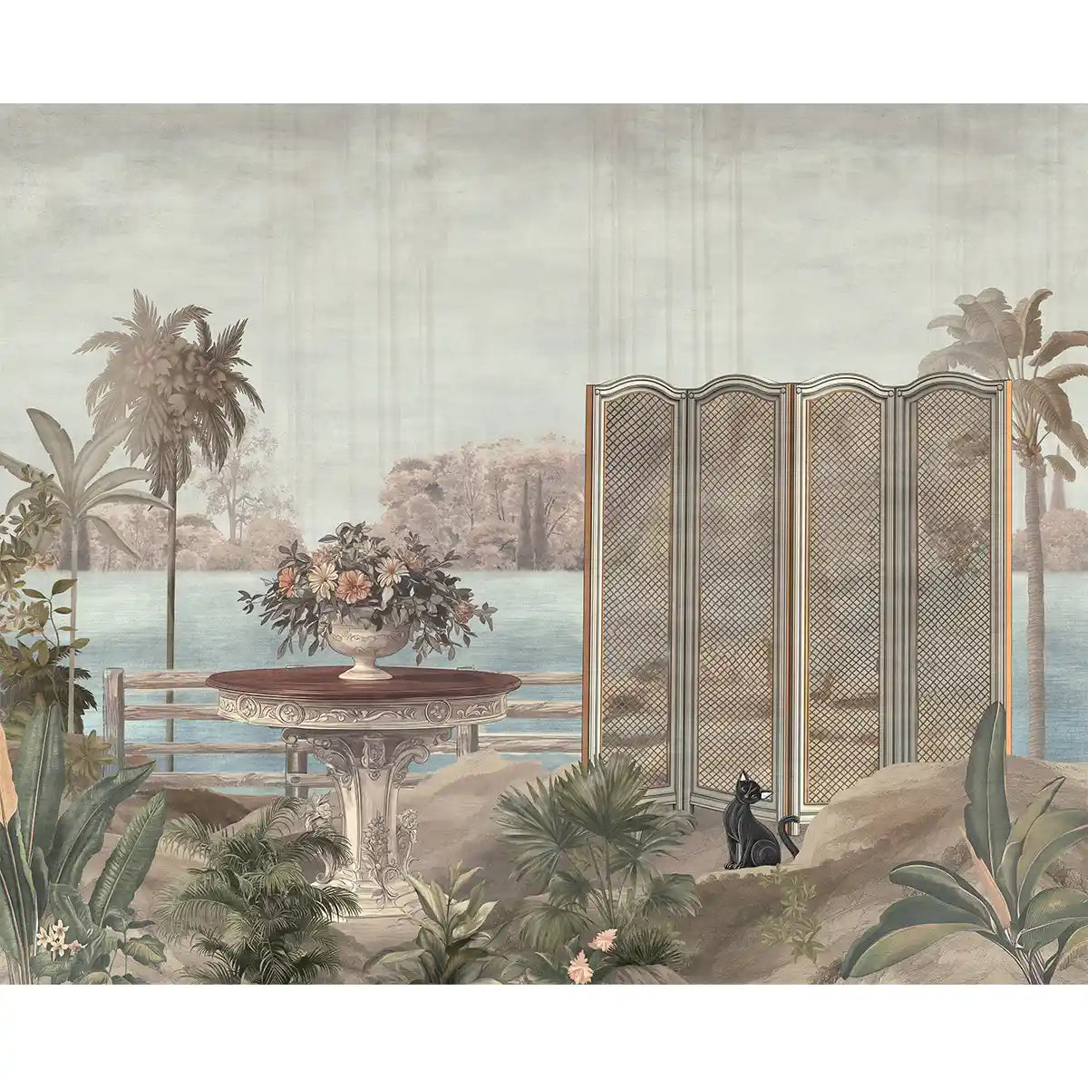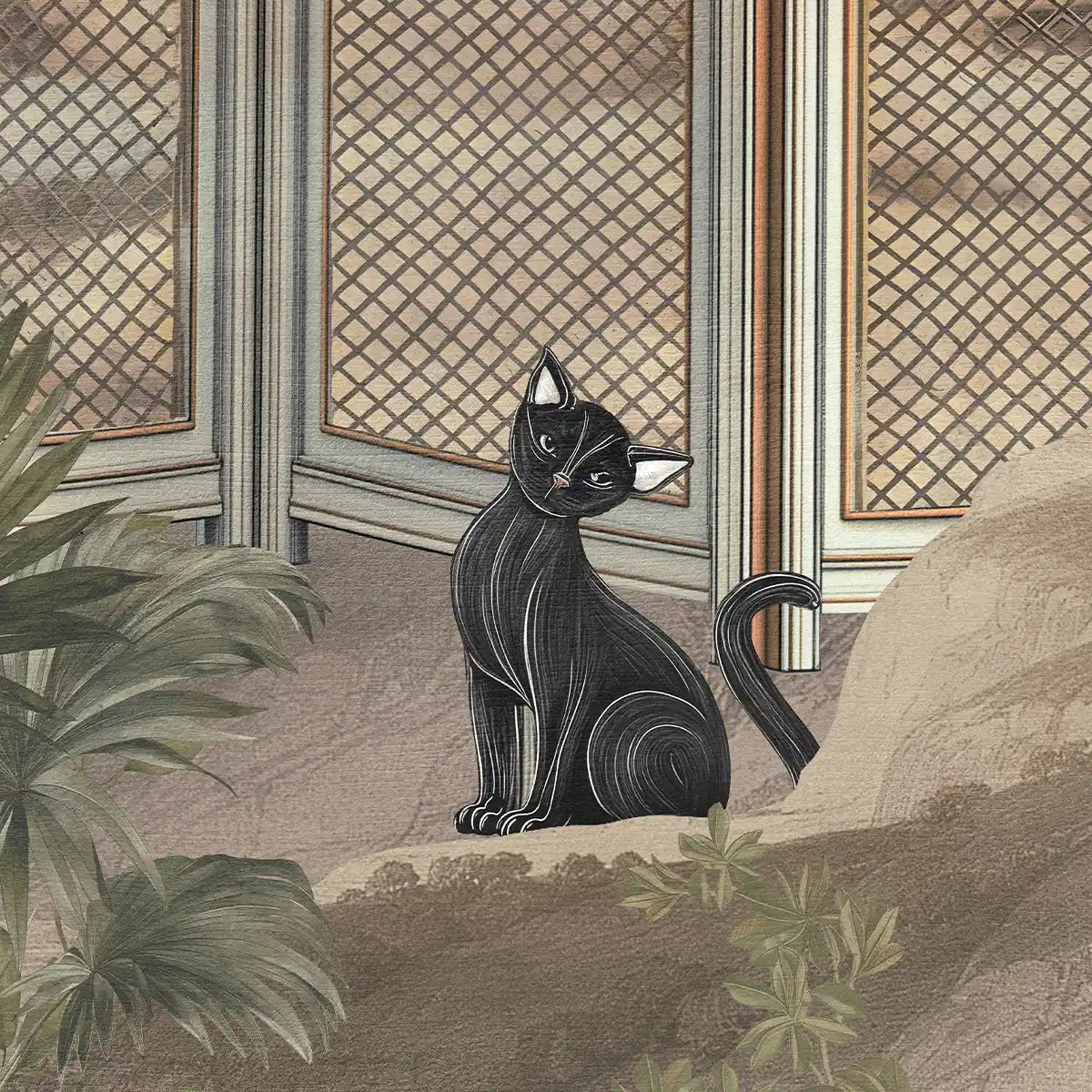 This design captivatingly blends botanical elements, a classic screen, and a curious black cat within a vintage setting, defined by intricate details and a touch of whimsy, featuring lush foliage, a formal screen, and a solitary cat.