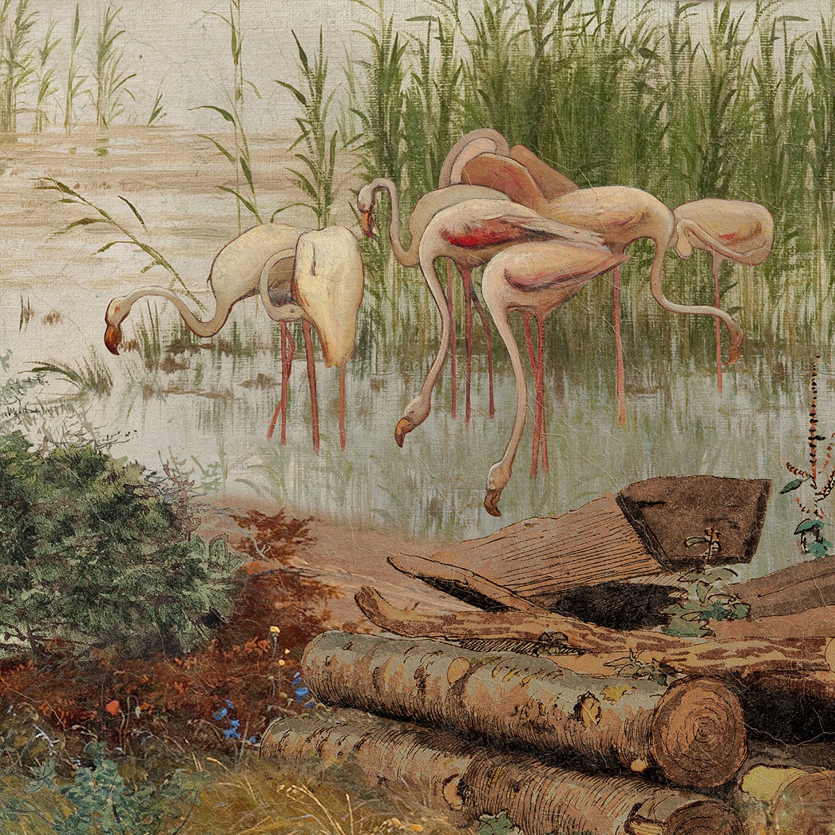 Transform your living space with Britannia Oasis, a European-inspired room wallpaper. Embrace vintage charm as old-world buildings, elegant flamingos, and lush gardens create an enchanting ambiance.
