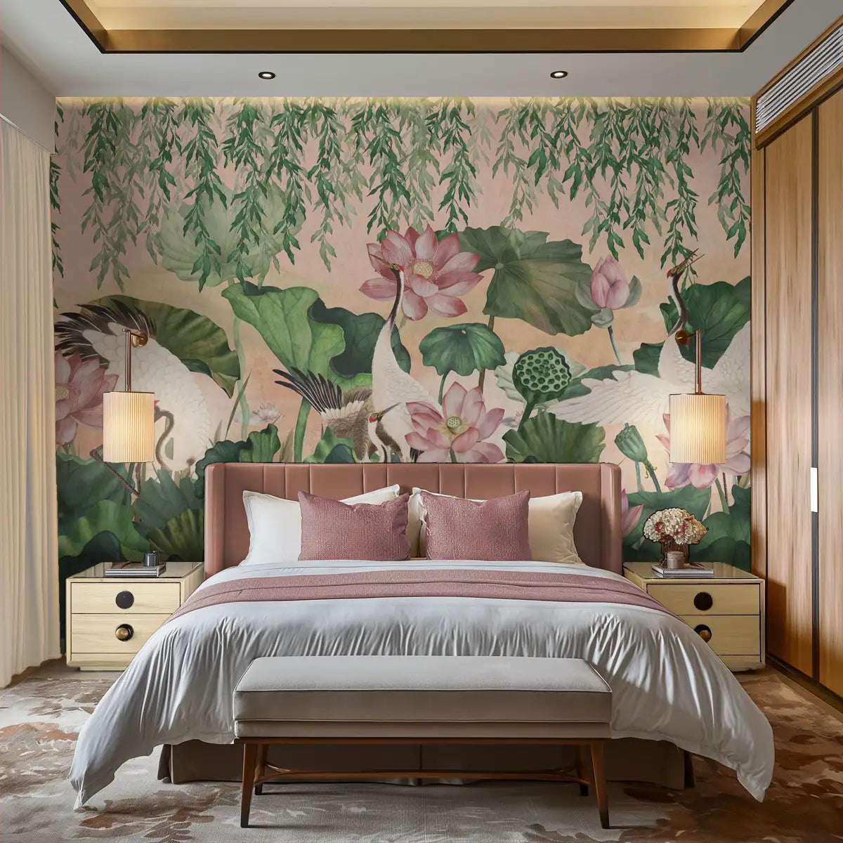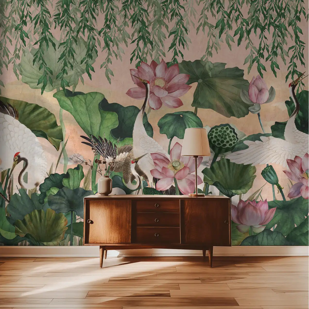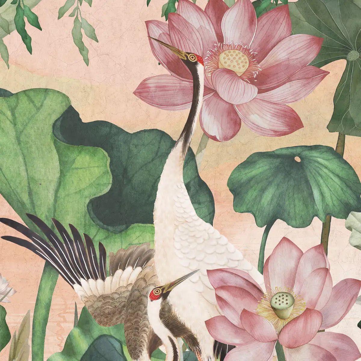 Introducing "Lotus Garden, Floral Wallpaper Sepia Background" This exquisite floral design features blooming lotus flowers, surrounded by lush greenery and shimmering water with graceful cranes. The delicate petals and vibrant colors create a serene and peaceful atmosphere.