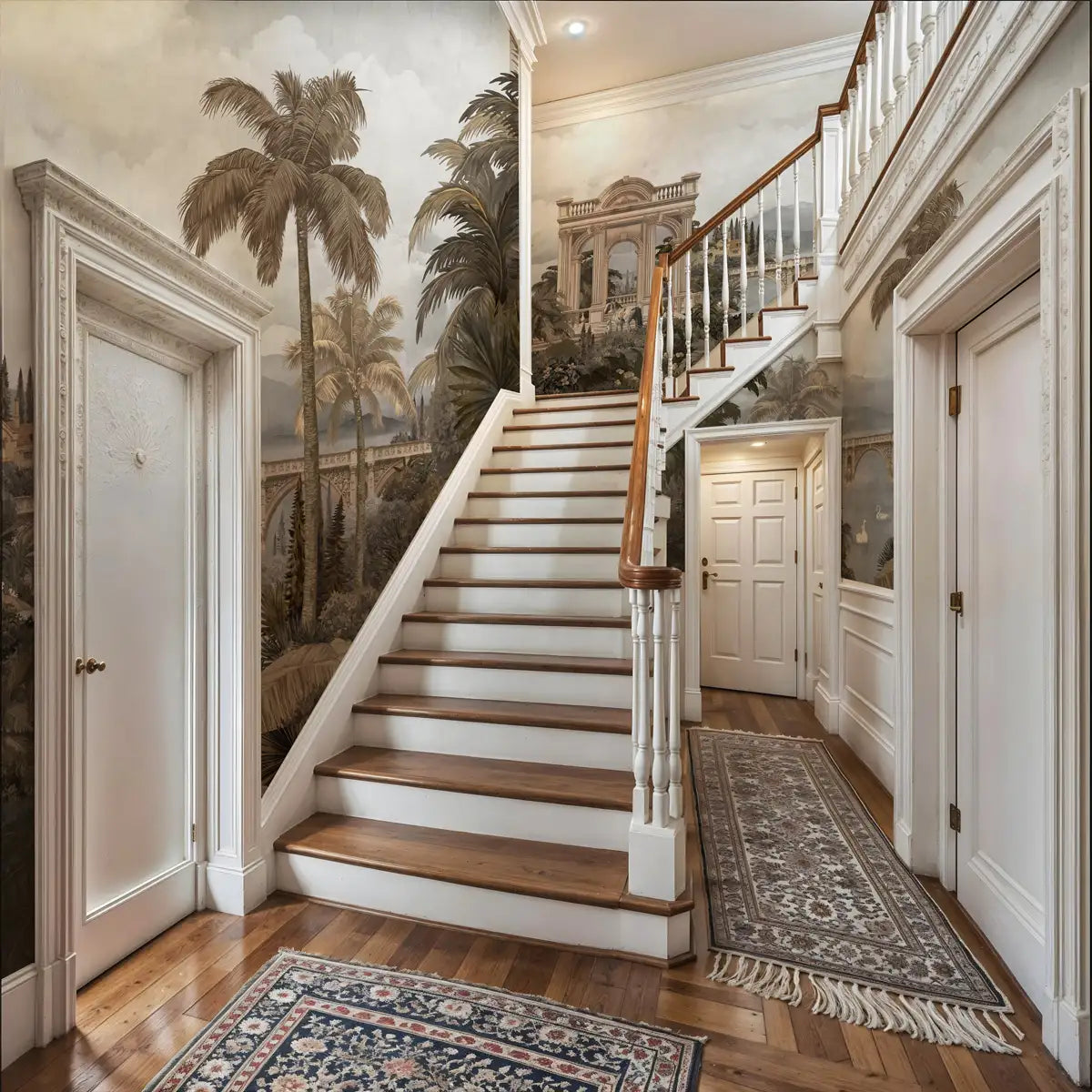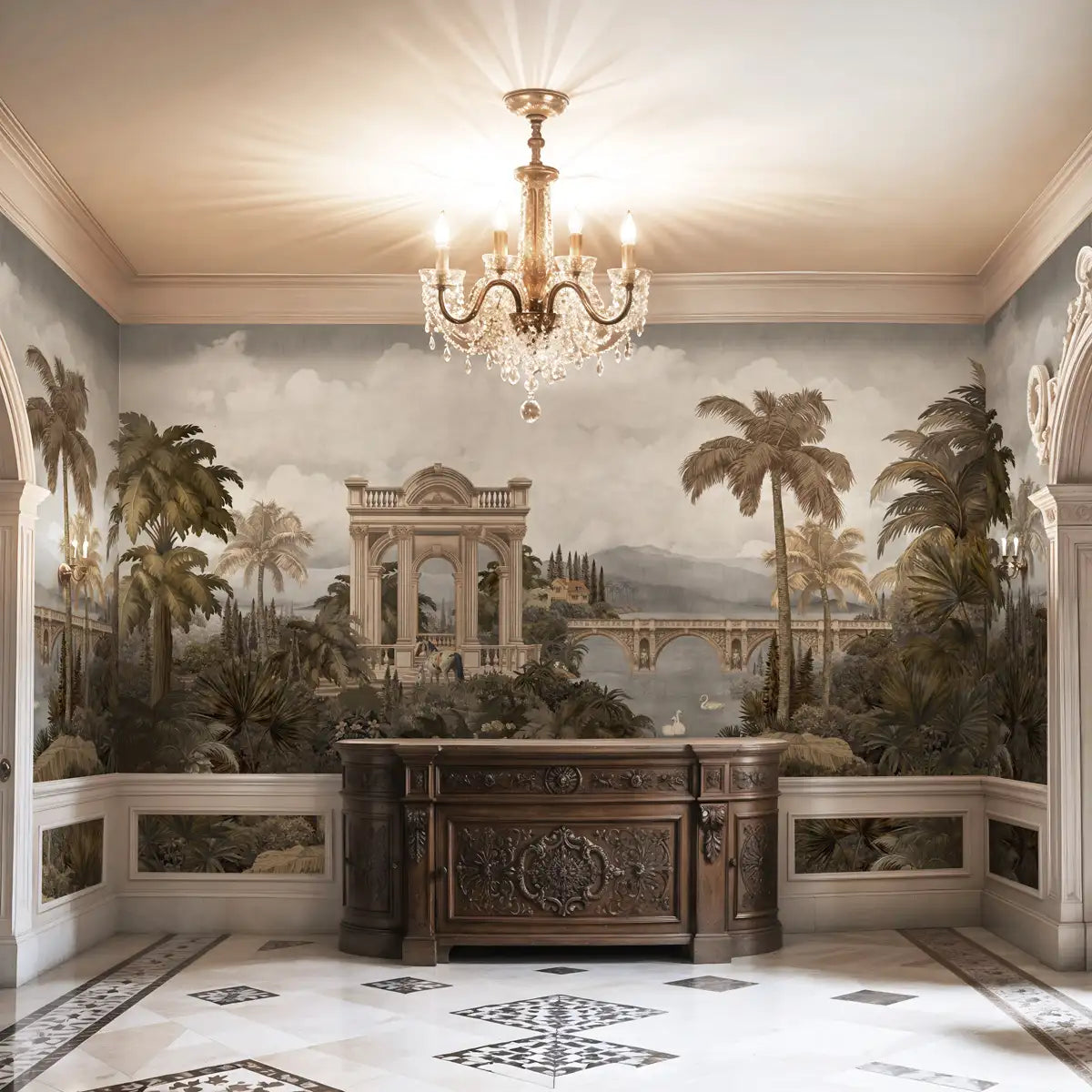 Introducing "Majestic Foliage Epoch Wallpaper" A breathtaking panorama reminiscent of a European landscape painting. Majestic trees, Crafted in a variety of captivating blues, frame the scene, their intricate details and lush foliage creating a sense of awe-inspiring beauty. Green & Sepia.