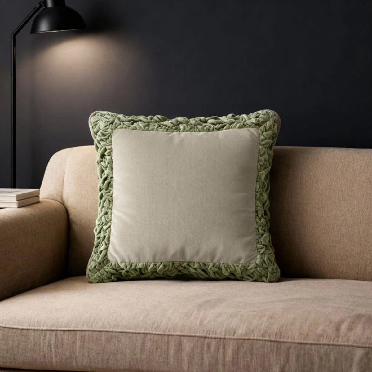 Introduce a vibrant yet elegant accent to your home with the Jhalak Ivory and Green cushion, featuring a luxurious velvet center in a beautiful Ivory and Green shade. The cushion's exquisite craftsmanship is defined by the densely ruched, Peach velvet border that frames the central panel, creating striking depth and texture. This statement cushion offers a sophisticated fusion of color and tactile detailing, perfect for elevating any contemporary or eclectic decor.