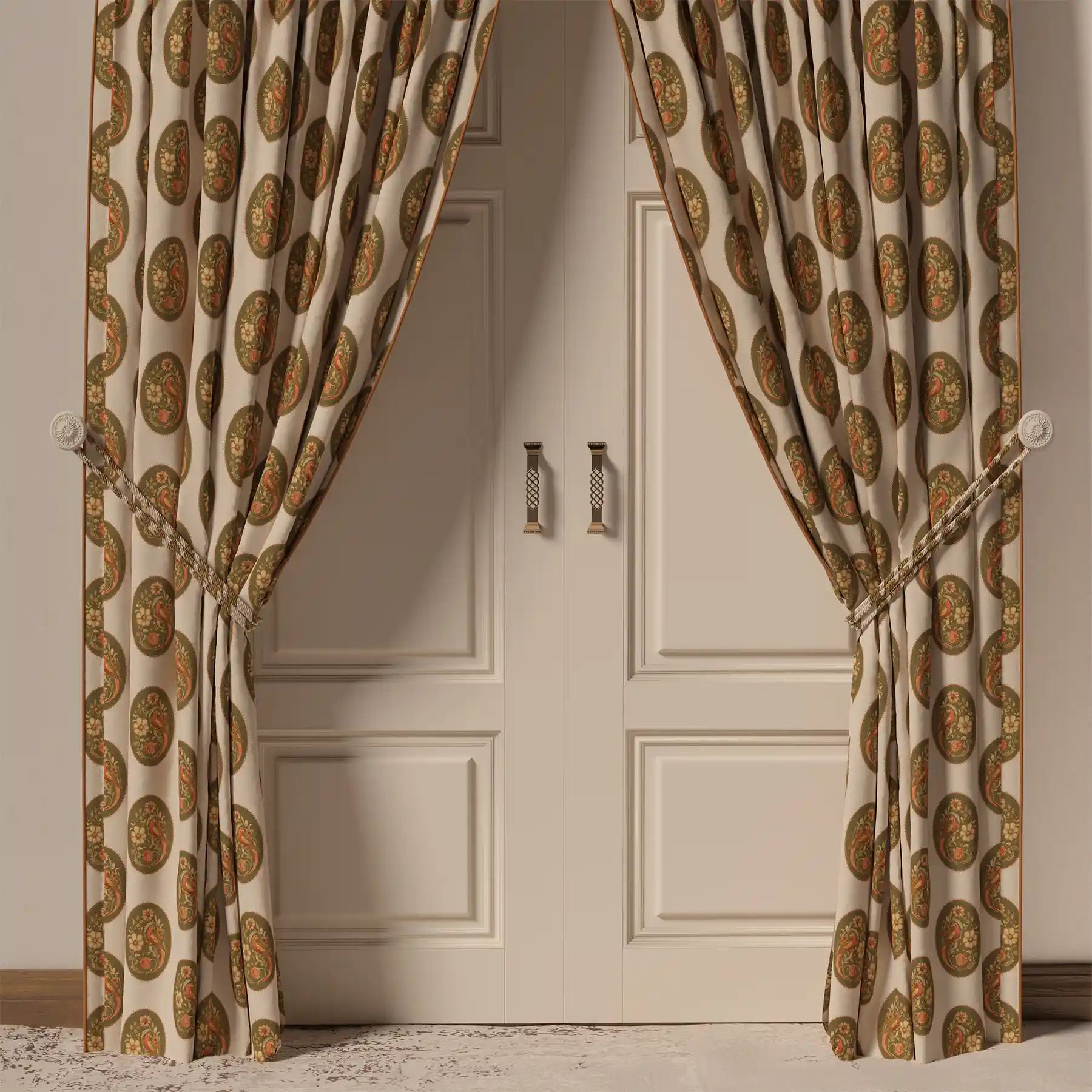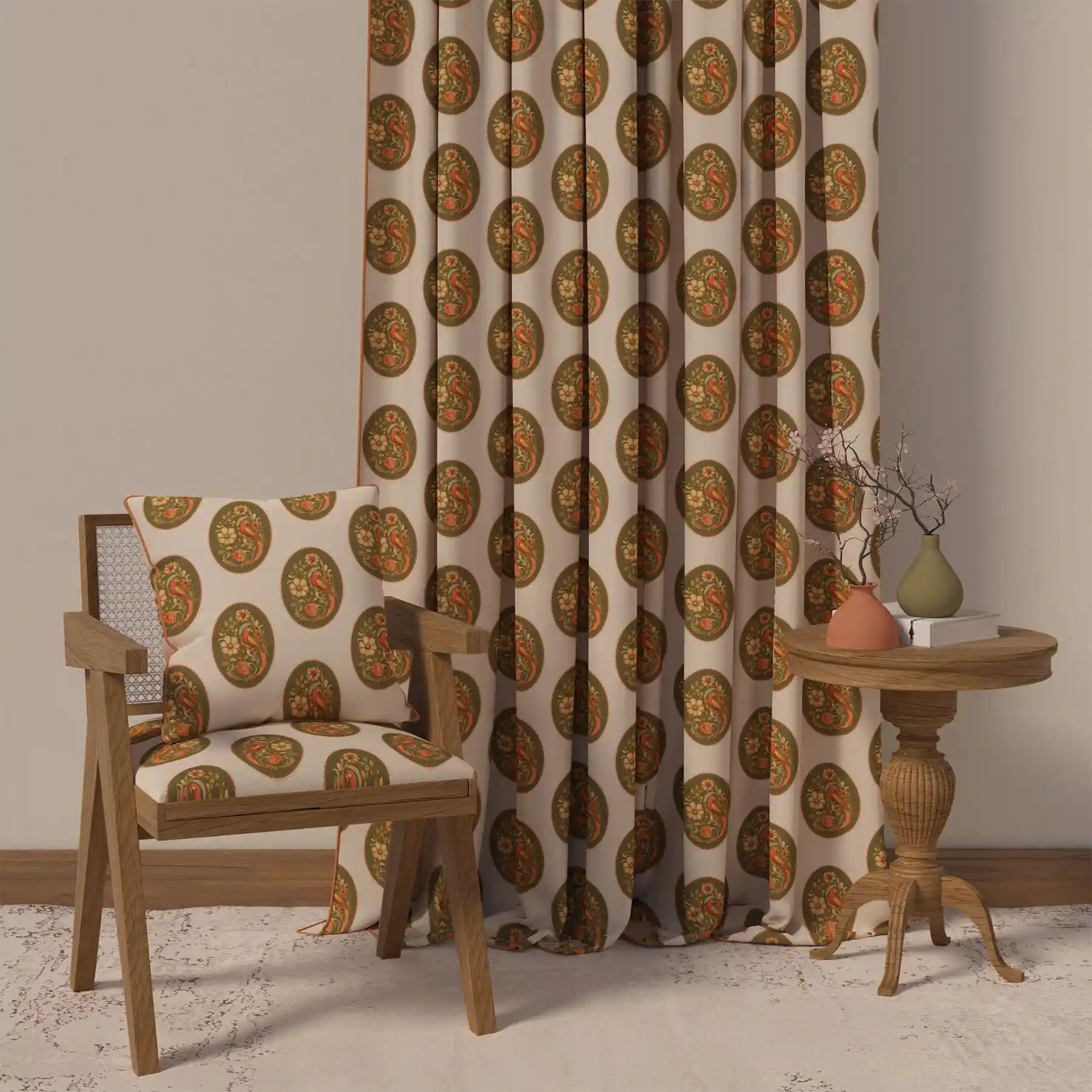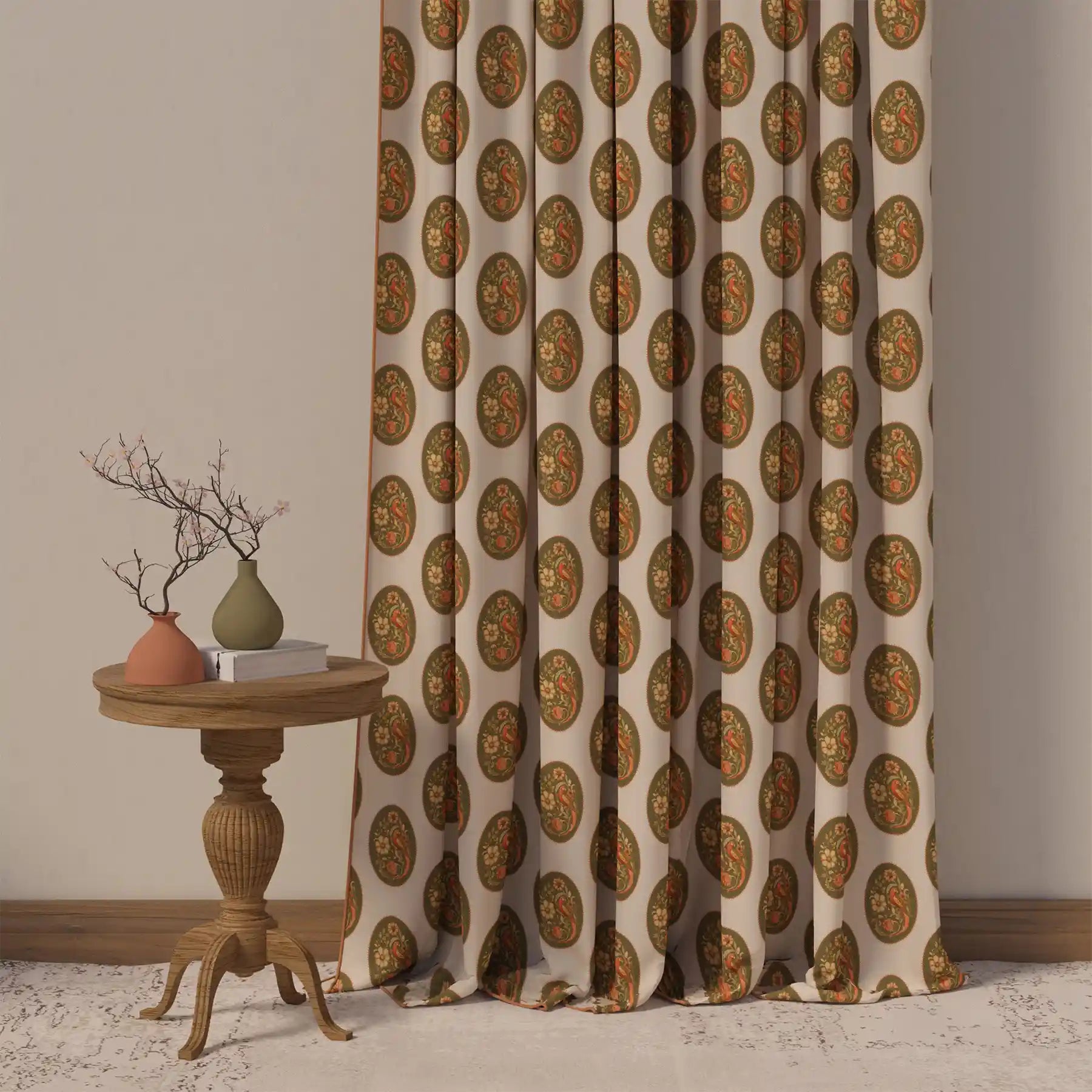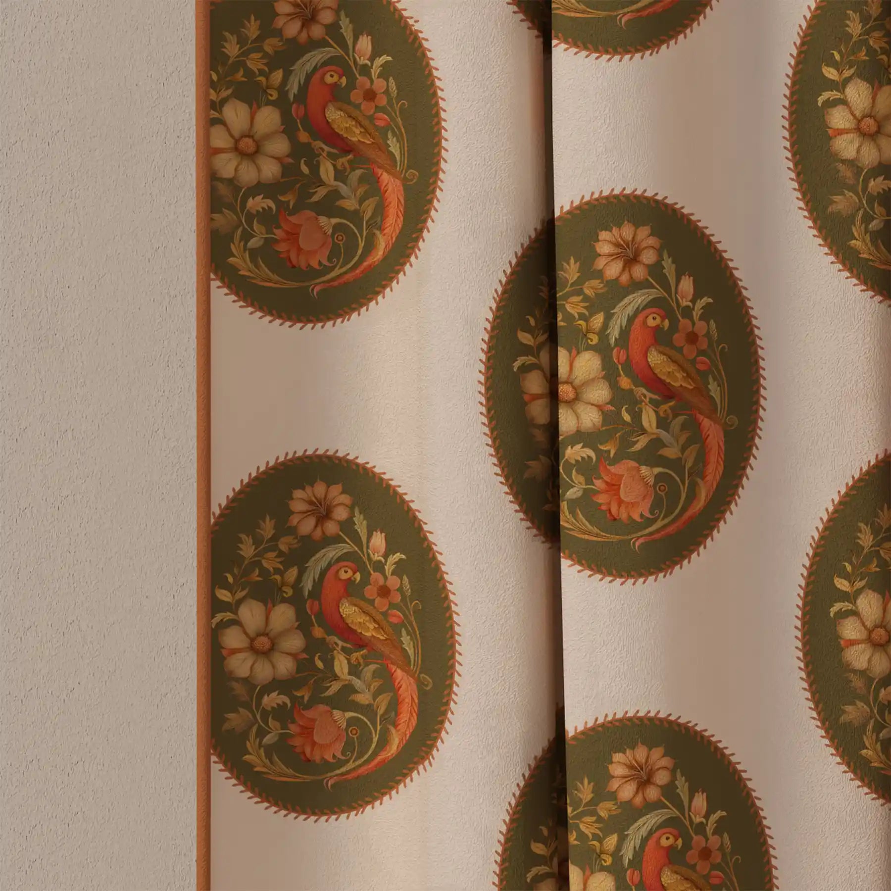 Bring timeless elegance to your home with our Vintage Blossom Pipin Curtain. This stunning piece features a beautiful, repeating pattern of ornate ovals, each containing a delicate vintage bird and floral motif. The warm color palette of olive green and rich terracotta against a soft beige backdrop creates a sophisticated and inviting feel. A clean, piped edge provides a crisp finish to this classic design. Perfect for adding a touch of heritage and refined style to any living room, dining room, or bedroom.