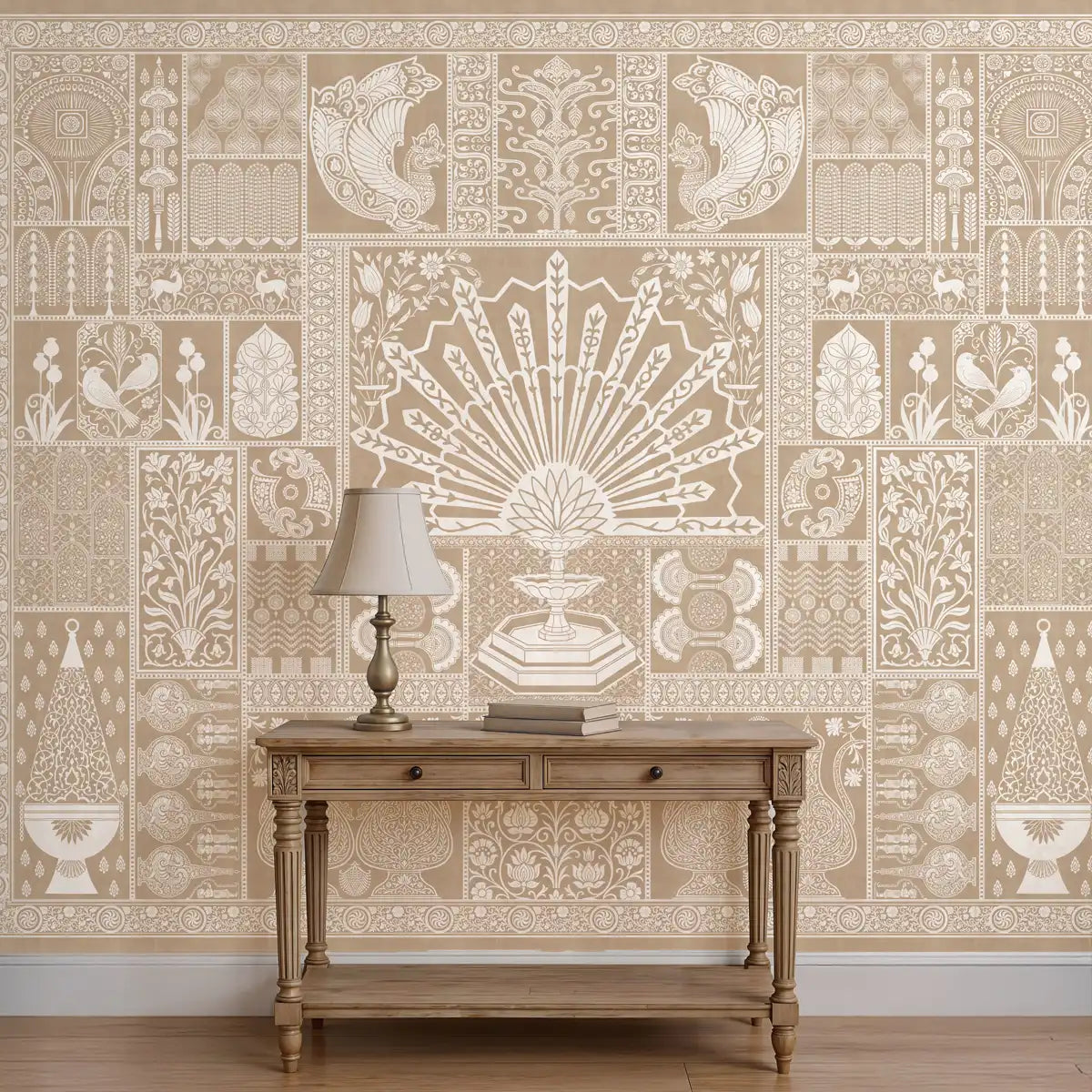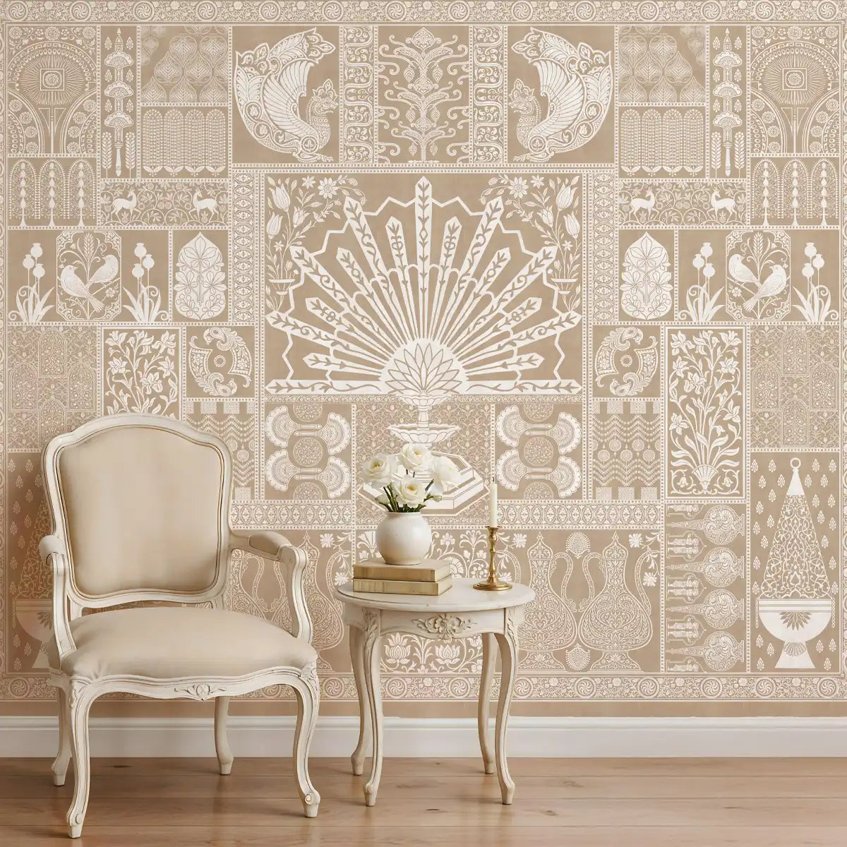 Step into an era of regal elegance with the Nizam wallpaper, a masterpiece that reimagines traditional Indian heritage for the modern home. Rendered in our signature Clay Beige—the definitive color of understated luxury for 2025—this design serves as a sophisticated backdrop that feels both historic and contemporary.