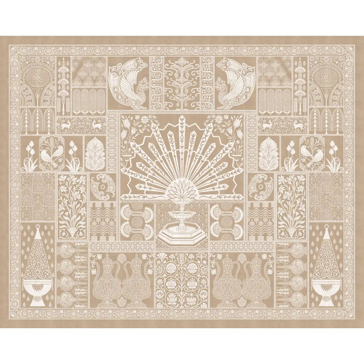 The design is structured like a gallery of miniature paintings, featuring intricate panels of Mughal-inspired arches, dancing peacocks, grand fountains, and delicate floral Jali work. The monochromatic palette allows the exquisite line work to shine without overwhelming the space, making it perfect for living rooms, foyers, or feature walls where you want to tell a story of grandeur and grace.