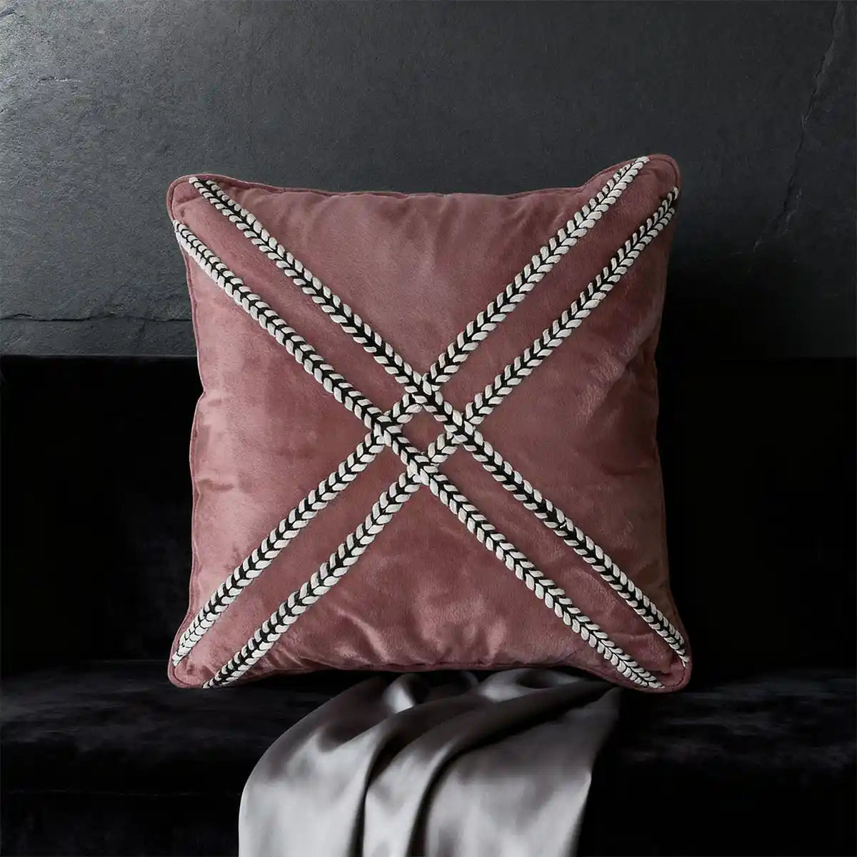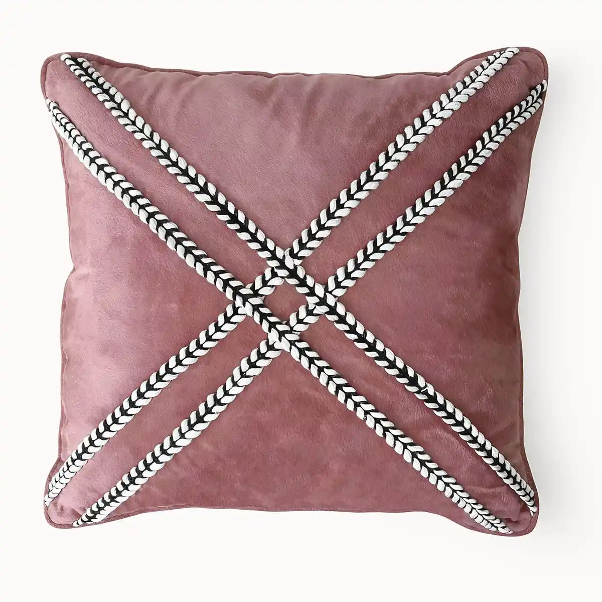 Infuse your interiors with sophisticated warmth using the blush cross braided cushion, beautifully crafted from sumptuous blush velvet fabric. The design highlights exquisite craftsmanship through a bold, woven 'X' pattern created with contrasting black and white braided trim. This designer cushion offers a textural and visually engaging accent piece perfect for enhancing any modern or elegant decor setting.