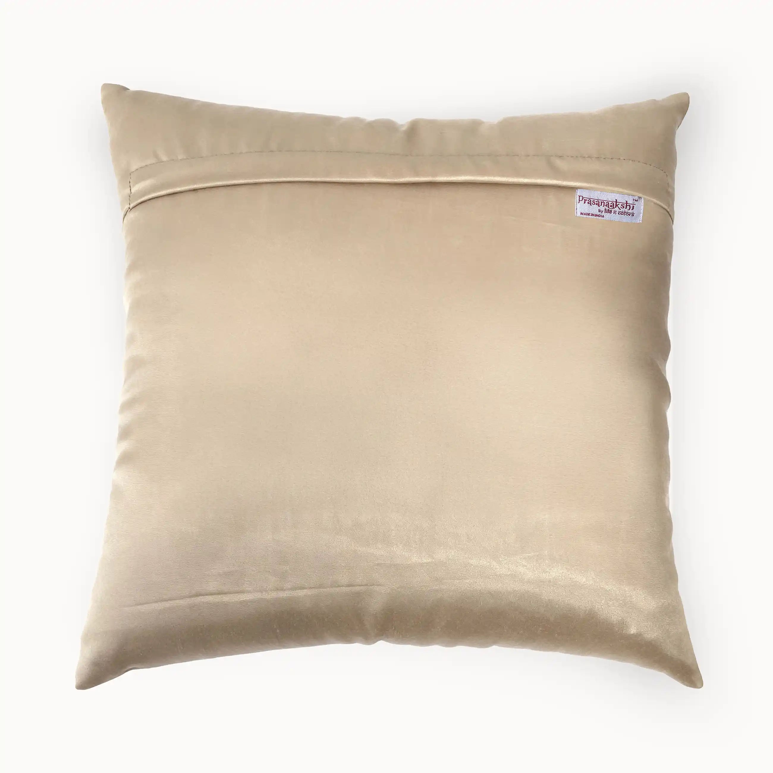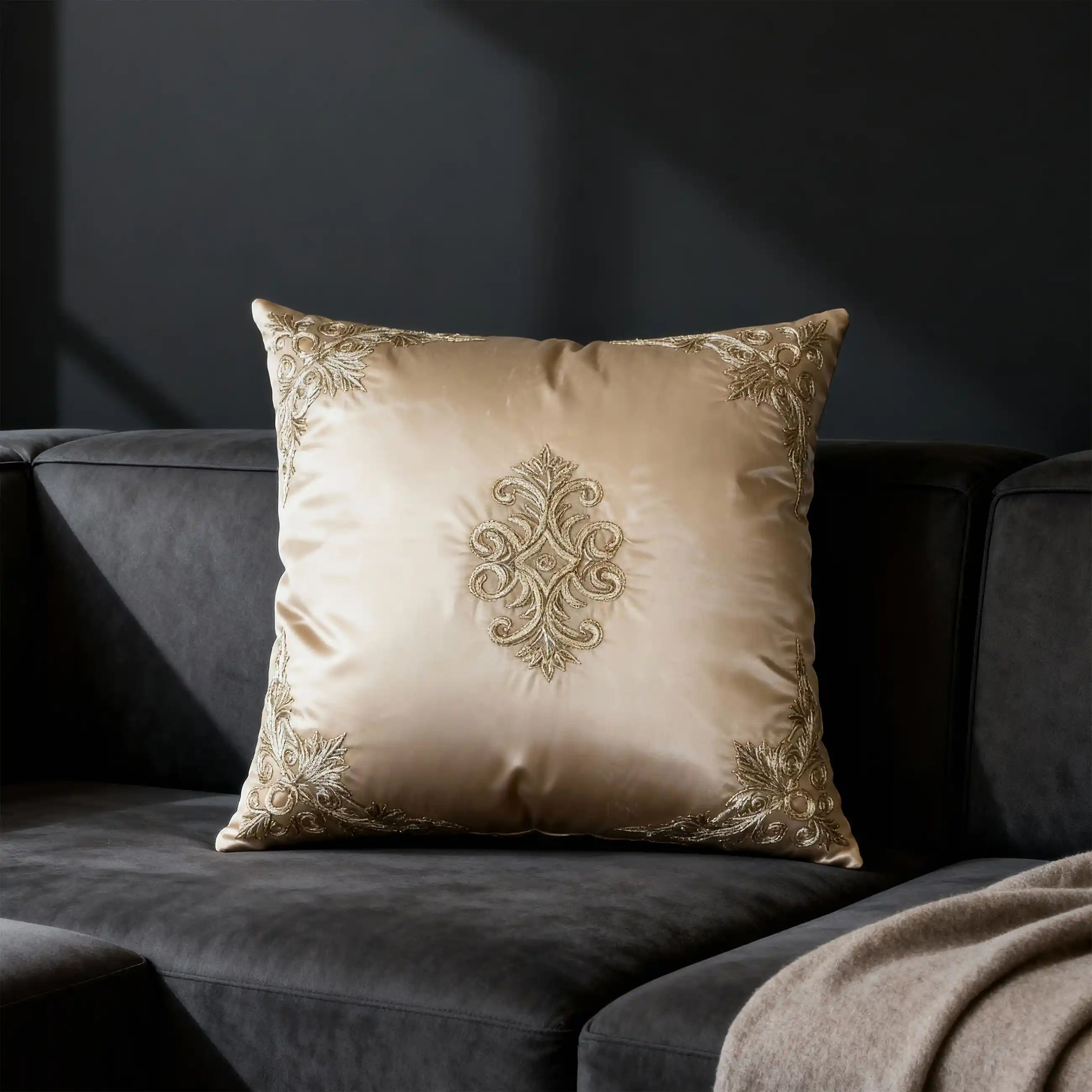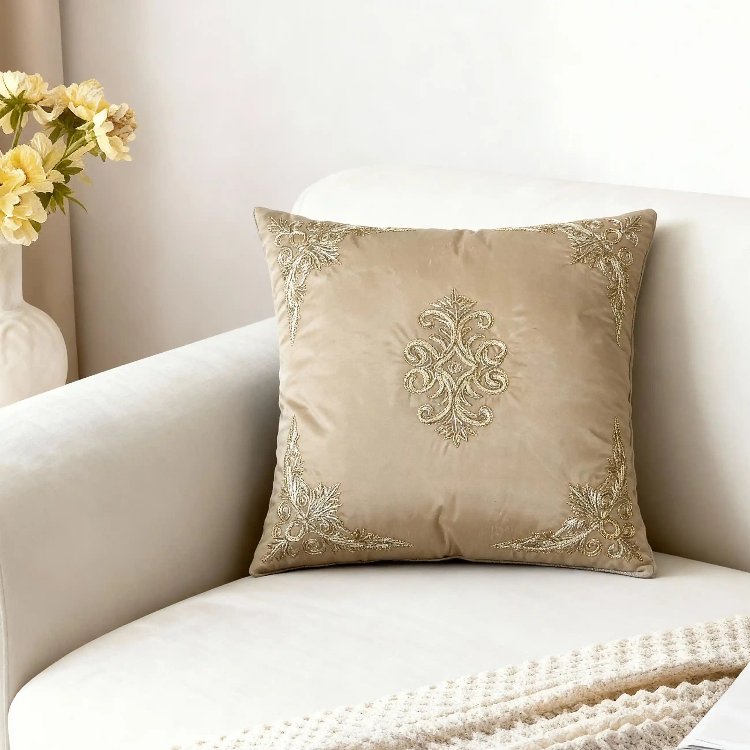 • Infuse your living space with the timeless elegance of the French Rococo era. The Rocaille Charm Embroidered Cushion Cover is crafted from a lustrous champagne-hued fabric that instantly adds warmth and luxury to any room. It features an exquisite central ornamental motif flanked by intricate corner accents, all embroidered in shimmering metallic gold threads that catch the light beautifully.