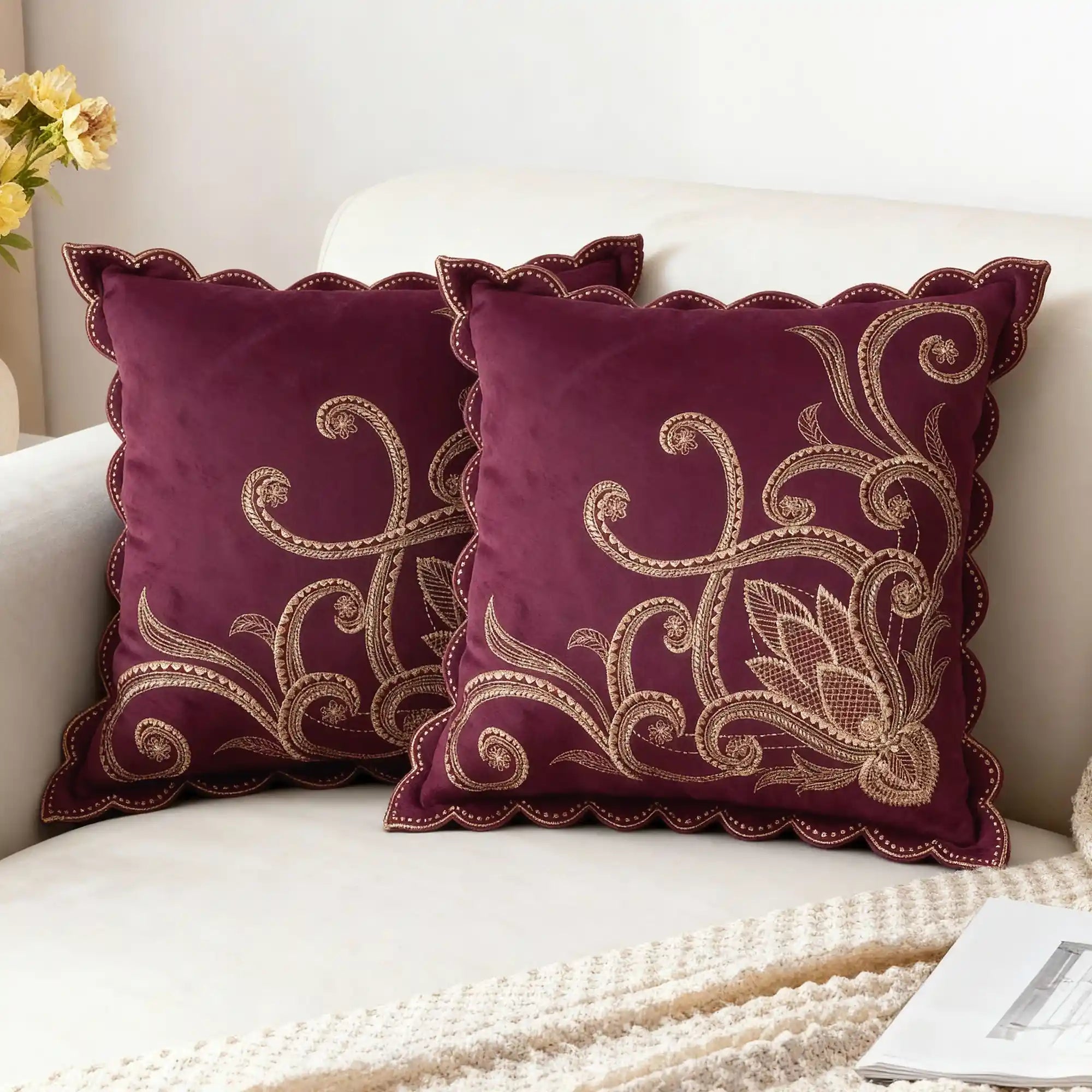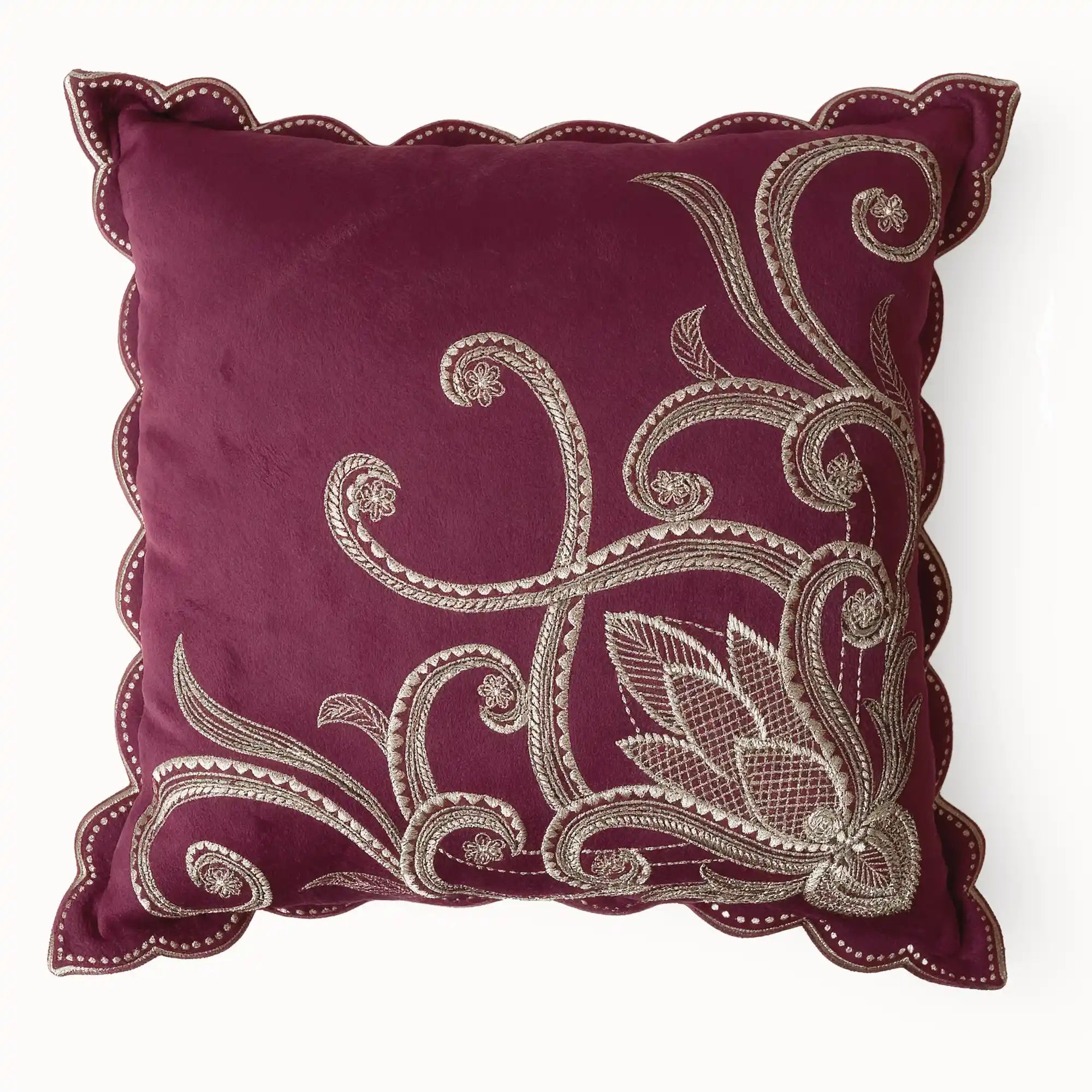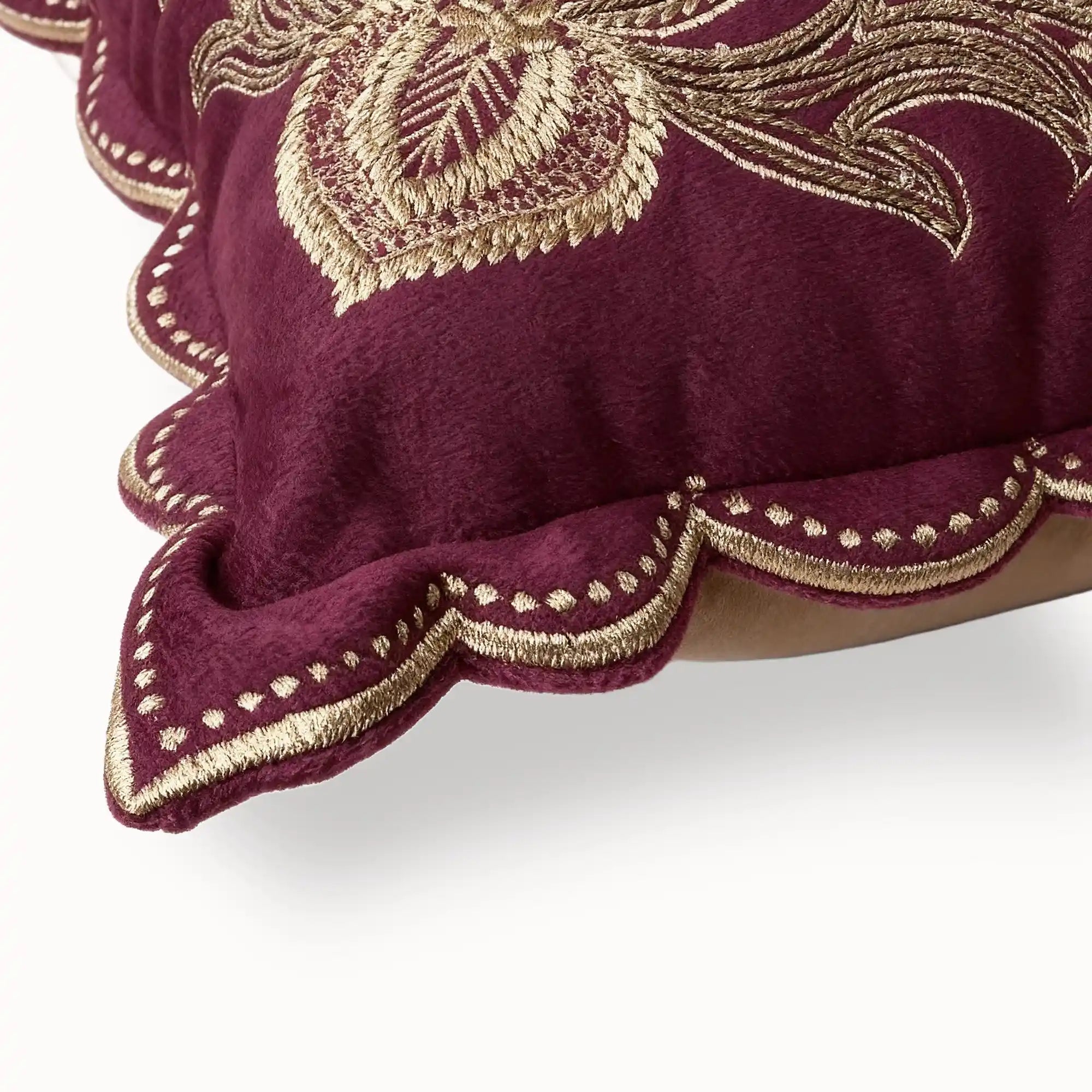 Immerse your space in opulent luxury with the Royal Vine Cushion Cover, featuring rich maroon velvet and a distinctive scalloped border. The exquisite craftsmanship is highlighted by the sweeping, intricate gold embroidery of an ornate vine and floral motif that dominates the cushion face. This designer cushion cover introduces sophisticated texture and dramatic, regal detailing, making it a true centerpiece for an elegant interior.