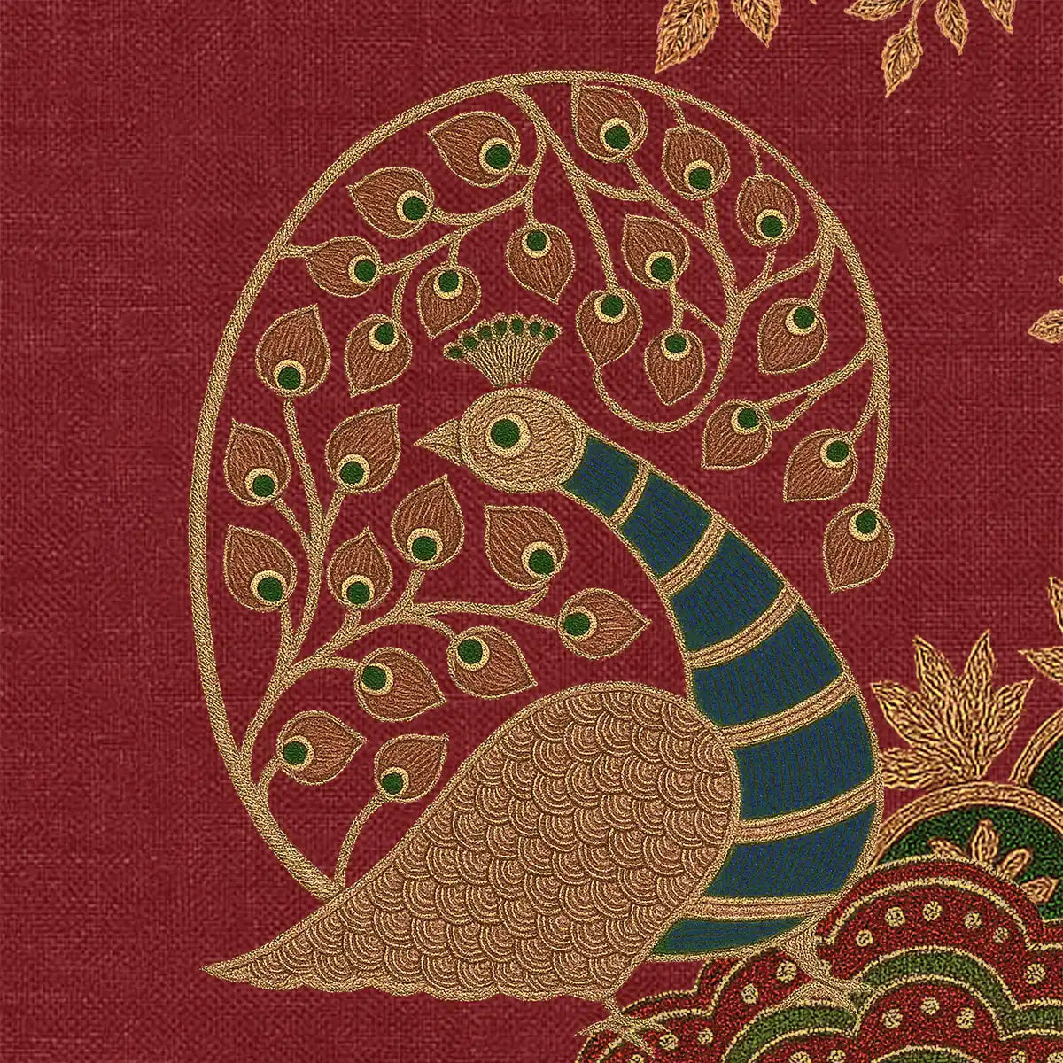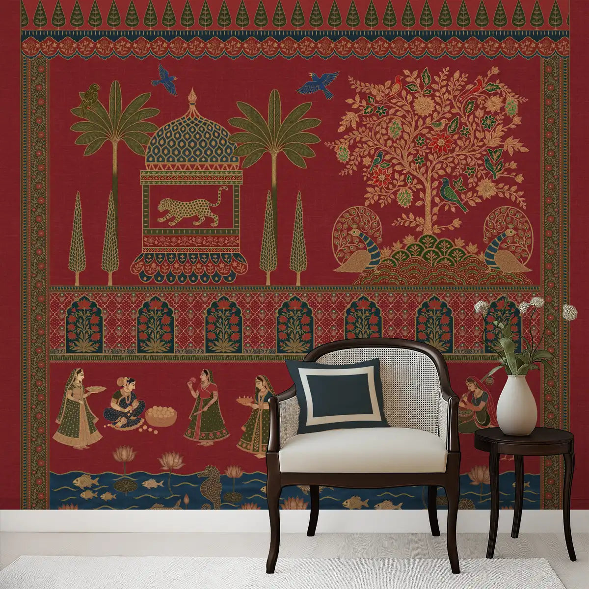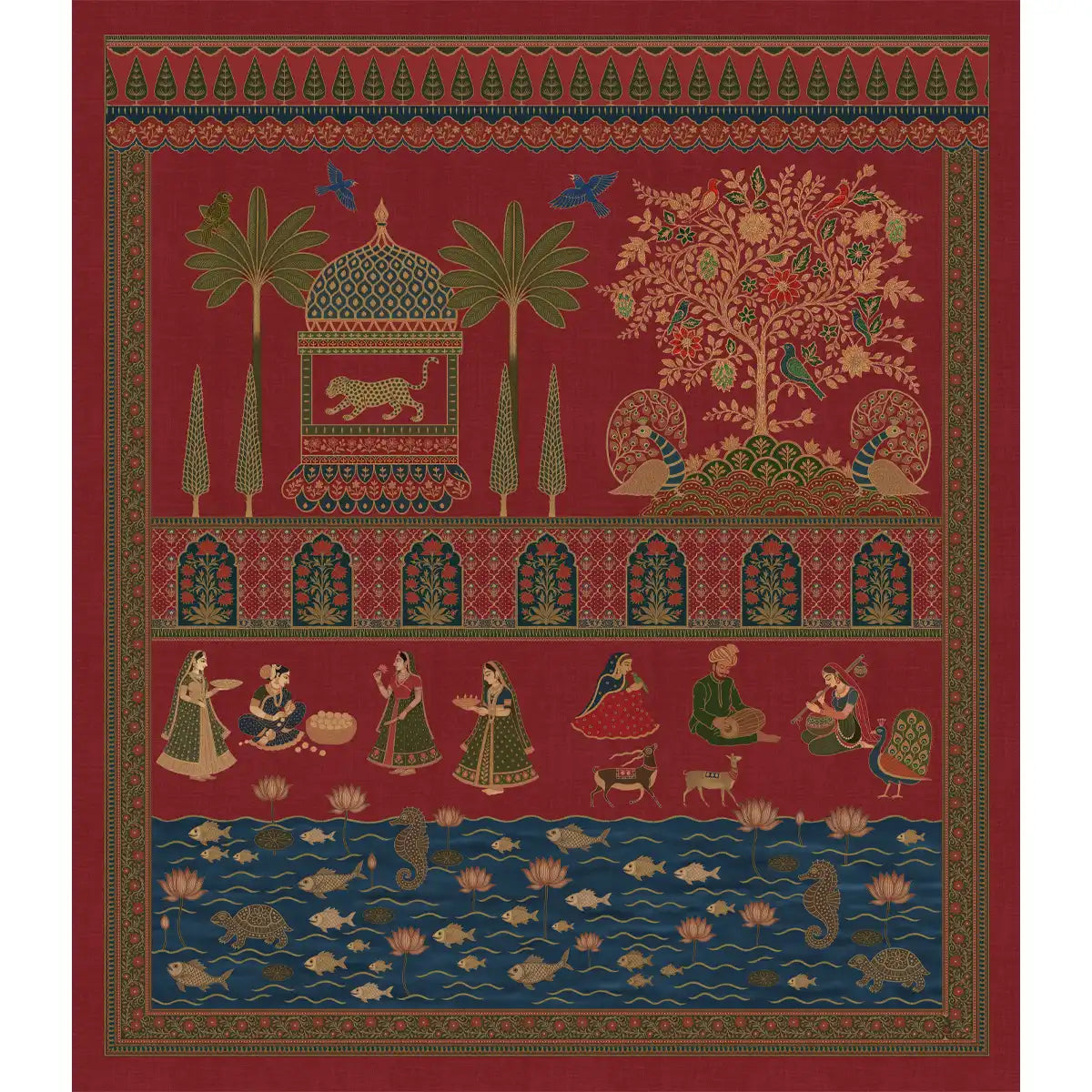 Celebrate the grandeur of Indian artistry with our Colors of India Wallpaper. This design features palace motifs, peacocks, tigers, and lush trees, all brought together in a tapestry of heritage storytelling. The bold red backdrop enhances the richness of the intricate details, making it perfect for creating a dramatic feature wall. Ideal for living rooms, dining areas, or boutique spaces, this wallpaper merges cultural depth with luxurious design, transforming interiors into timeless works of art.