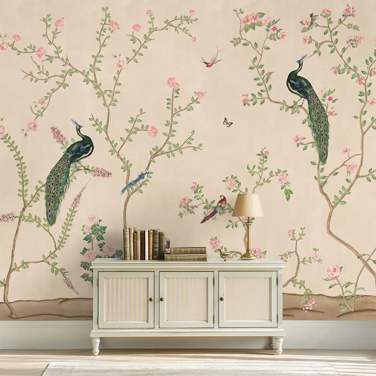 Bagiya, Pfauen-Chinoiserie-Tapete im indischen Stil, individuell gestaltet