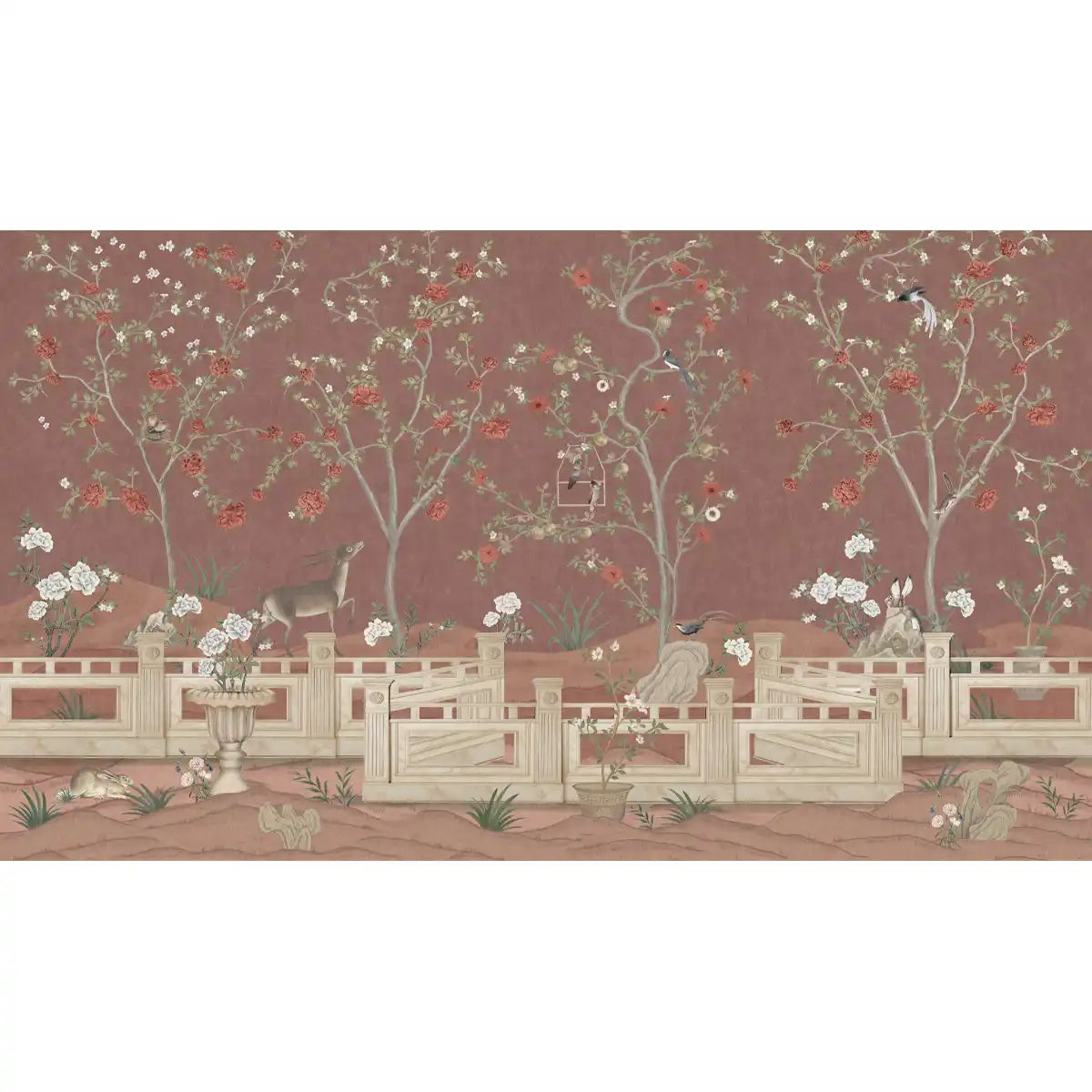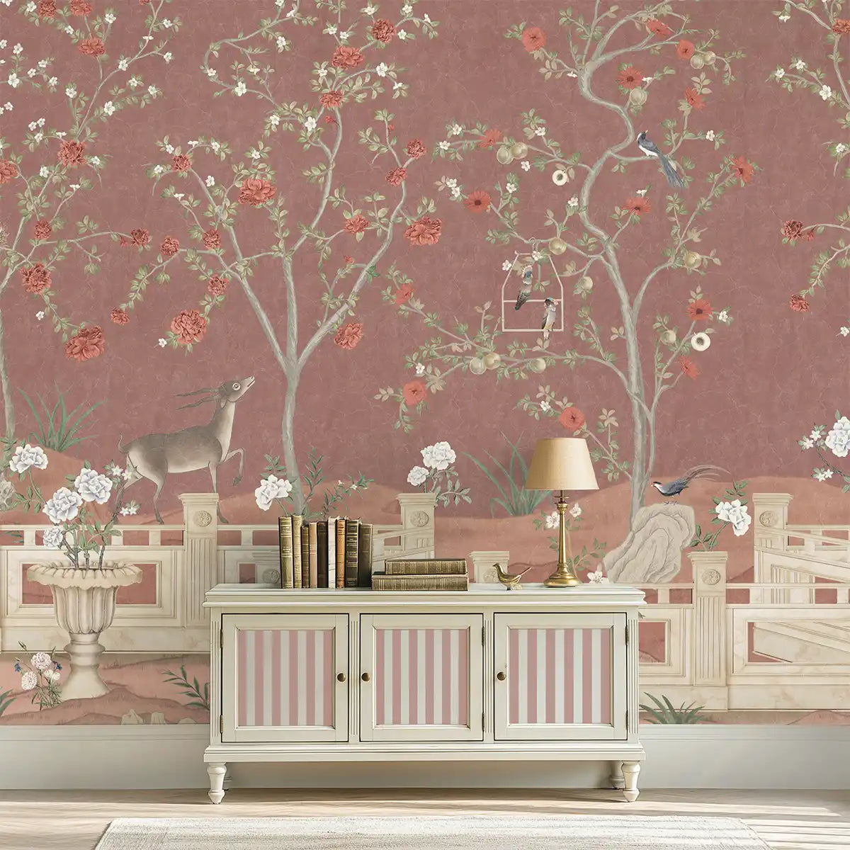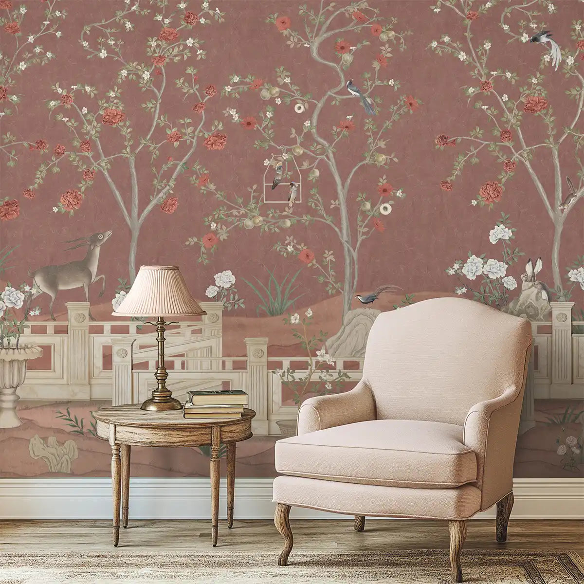 Dekorieren Sie Ihren Raum mit Rosa Chinoiserie, einer rosafarbenen Raumtapete voller europäischem Charme. Seine zarten Muster verleihen jedem Raum eine Aura von Eleganz und Gelassenheit.