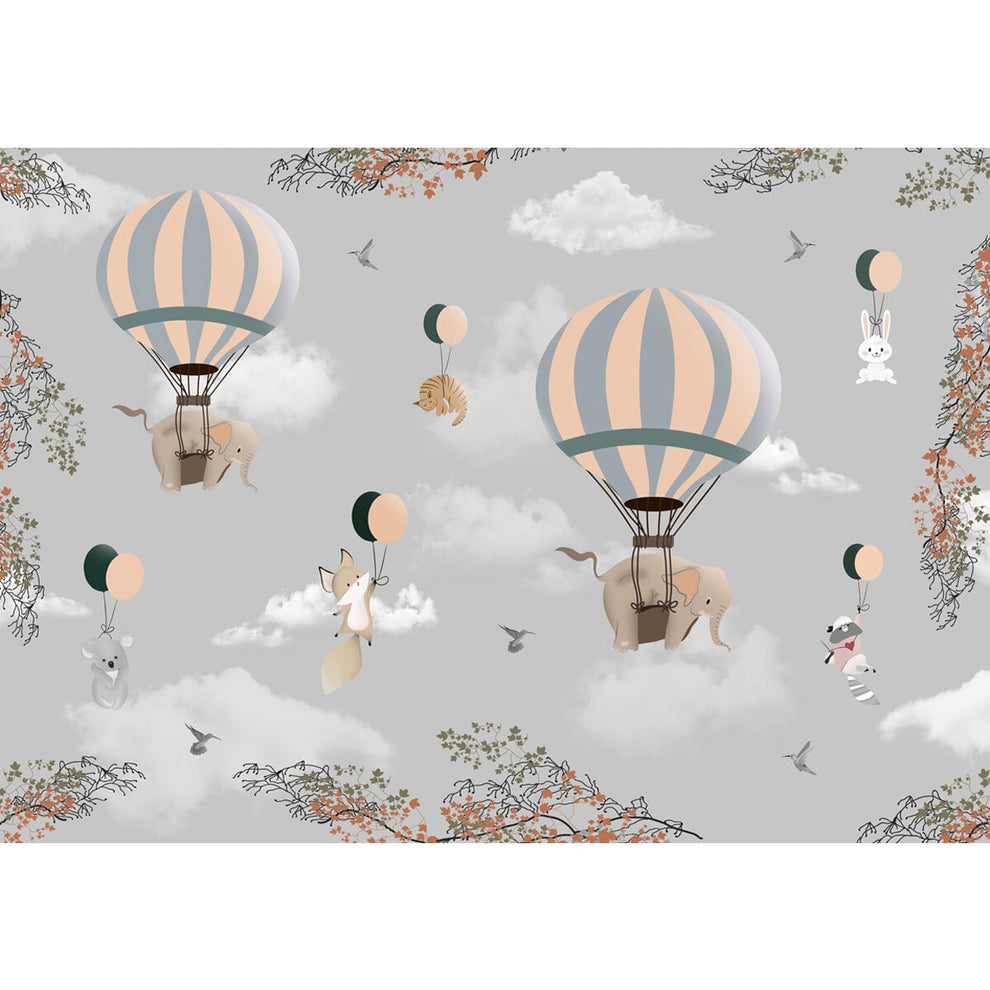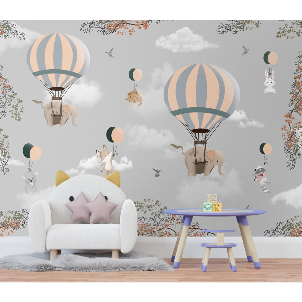 Verleihen Sie dem Kinderzimmer mit unserer Tapete mit bezaubernden Elefanten und Heißluftballons einen verspielten Charme. Dieses verspielte Design verbindet sanfte Tiermotive mit schwebenden Ballons und eignet sich perfekt für Kinderzimmer, Spielzimmer und Schulen und verzaubert Mädchen und Jungen gleichermaßen.