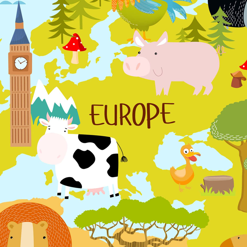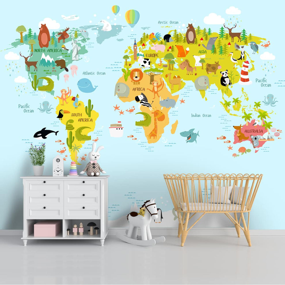 Weltkarten-Hintergrundbild für Kinder mit Tieren | Maßgeschneidert | Klare und lebendige Drucke | Pflegeleicht | Leben und Farben | Hergestellt in Indien